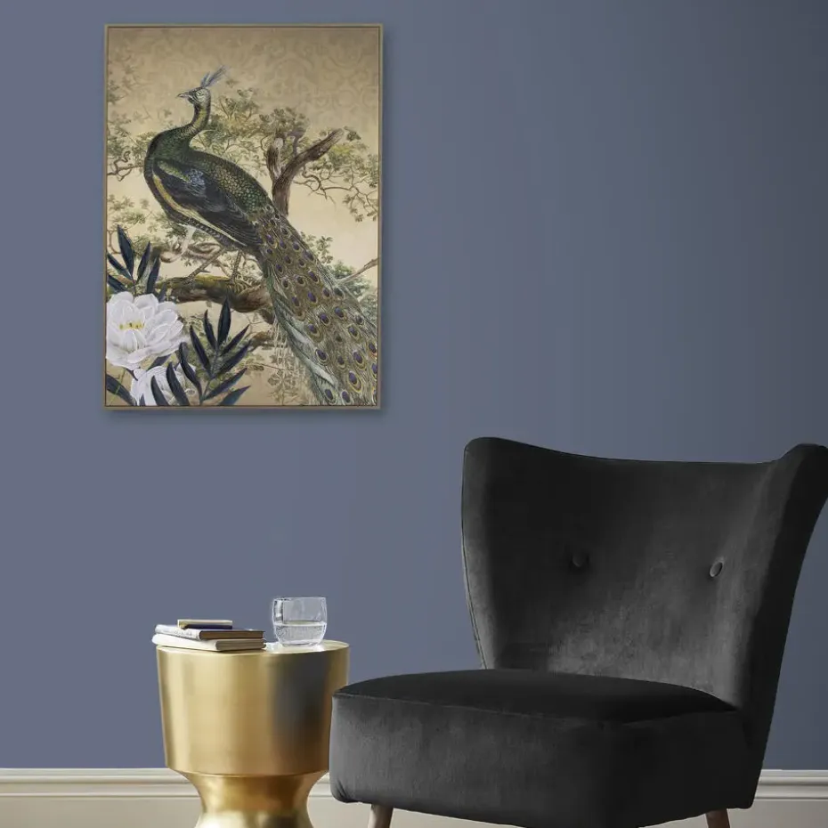 Het prachtige Peacock in Paradise is een handgeschilderde canvas in een mooie omlijsting, verfraaid met schitterende gouden, metallic details.