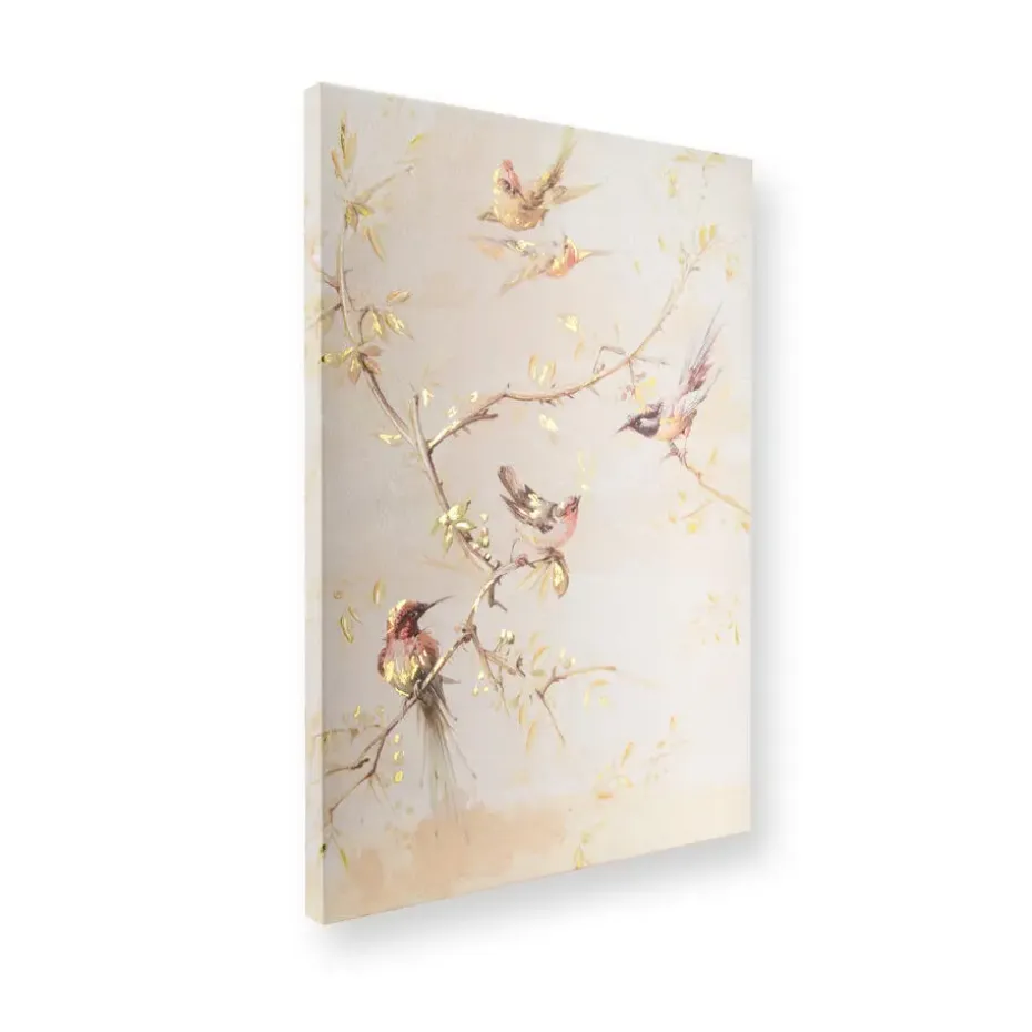 Ontdek het handgeschilderde canvas met gouden, metallic details, genaamd Sunset birds.