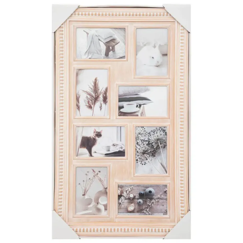 Collage fotolijst uit de Natural serie voor meerdere foto’s. Stel je foto’s tentoon met deze collage fotolijst in de kleur beige. Deze moderne foto collage bestaat uit 8x fotolijstjes voor foto’s met afmetingen van 10 x 15 cm. Materiaal: hout/glas. Merk: Atmosphera. Voorzien van ophangingen op deze verticaal op te hangen. Formaat: 37 x 66 cm. Wissellijst.