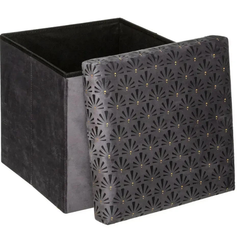 Poef/zit krukje/opslag hocker, model Royal, van een op fluweel lijkende stof, met leuke print aan de bovenzijde. De te vullen met spullen hocker is opvouwbaar tot plat en is een opslag box met deksel, waar je op kan zitten. Kleur: fluweel Donkergrijs. Materiaal: MDF en polyester stof. Afmetingen: Dia 38 x H38 cm. Gasten bijzet krukje voor als u extra zitplaatsen nodig hebt. Altijd handig om thuis te hebben staan. Geschikt voor kinderen en volwassenen. De opslagruimte is maar liefst 60 liter. Als u deze niet meer gebruikt, klapt u deze eenvoudig in, zodat het weinig ruimte inneemt. 1 persoons model.