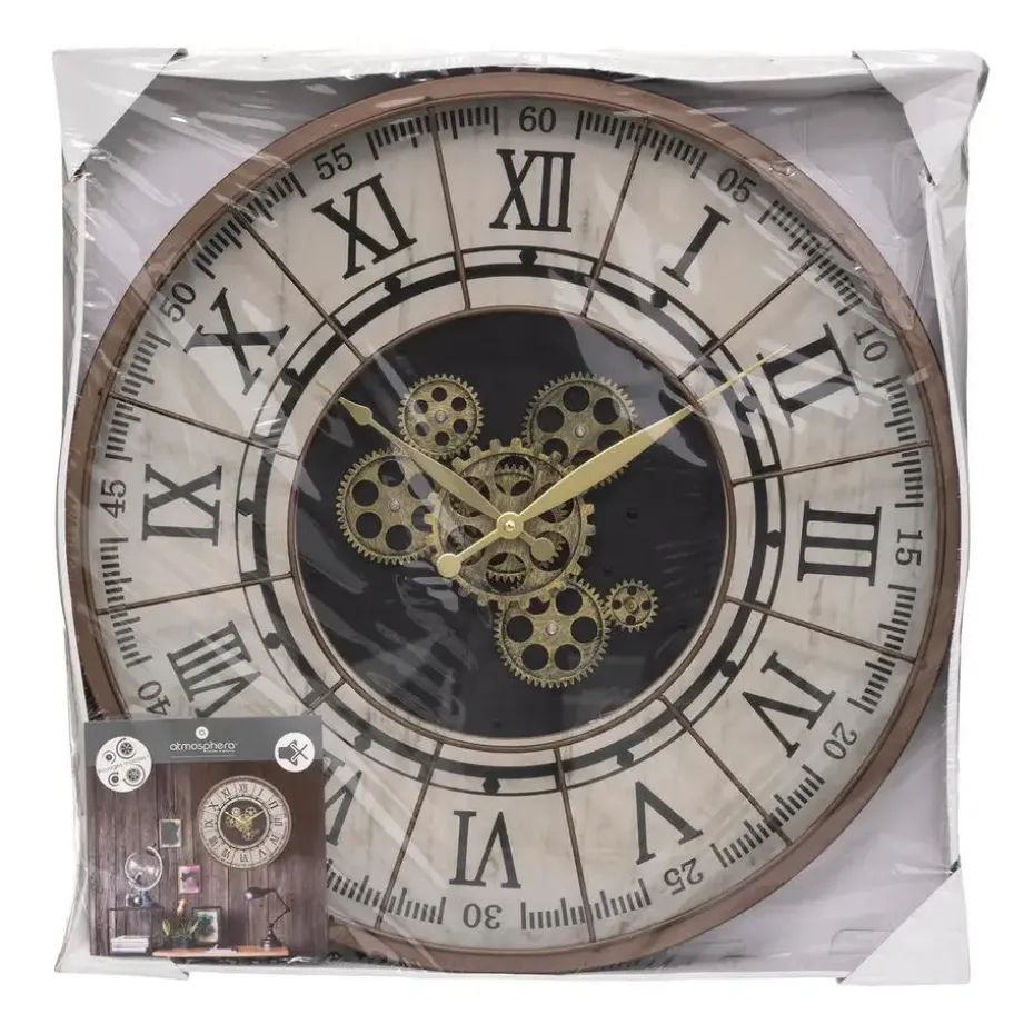 Wandklok Stella Mare Vintage Metal voor aan de muur/wand in de huis/studeerkamer met een diameter van 57 cm en dikte 7 cm. Grote klok met zichtbare en werkzame tandwielen. Kleuren: lichtbruin/transparant glas. Met Romeinse cijfers. Aan de achterkant zit een ophanging(bevestigingsmateriaal niet inbegrepen). Materiaal: metaal/kunststof/glas. Voeding: 3x AA-batterij, niet inbegrepen. Gewicht: 4 kilo. Dit klok ornament geeft meteen een fijne sfeer, met een mix van gevoelens tussen nu en toen. Mooie luxe klok, een blikvanger.