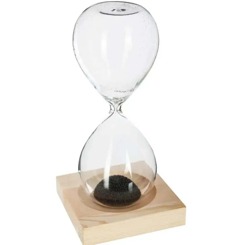 Zandloper cilinder in een luxe frame. Dit artikel kan ter decoratie of tijdsmeting gebruikt worden. Eenheid: 1 minuten zwart zand. Afmetingen: Dia 8 cm en H15 cm. Materiaal: glas/hout.