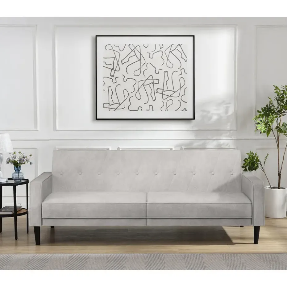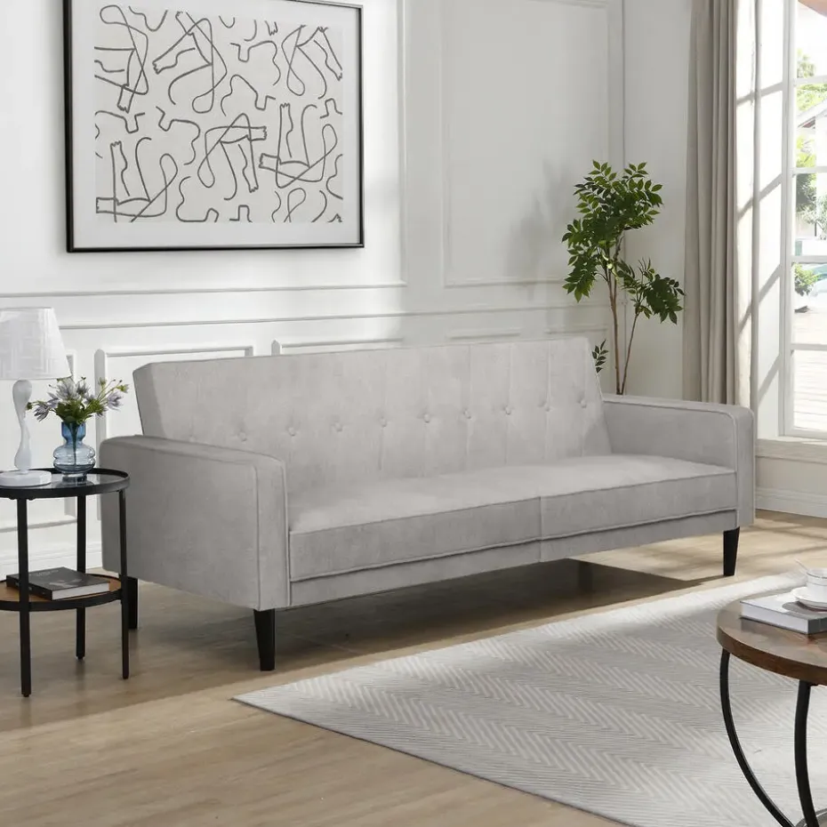 Deze elegante 3-zits slaapbank is bekleed met stof, waardoor het een stijlvolle en comfortabele toevoeging is aan elke woonkamer, logeerkamer of thuiskantoor. Ontworpen met praktisch in gedachten, verandert het gemakkelijk van een gezellige bank in een ruime slaapruimte, ideaal voor het huisvesten van gasten die blijven overnachten. Het stevige frame zorgt voor langdurig gebruik, terwijl de zachte bekleding warmte en textuur toevoegt aan uw ruimte. Met gemonteerde afmetingen van ongeveer 213 × 81 × 86 cm biedt het royale zitplaatsen en een compacte voetafdruk. Een slimme en veelzijdige keuze voor moderne interieurs.
