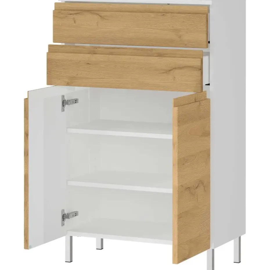 Met hun minimalistisch ontwerp en natuurlijke uitstraling passen de badkamermeubels Torres perfect in de modern landelijke sfeer. Het eikdecor straalt warmte uit terwijl de chroomkleurige pootjes zorgen voor een elegante touch. Deze badkamerkast is uitgerust met twee verstelbare legplanken en twee lades. Hierdoor creëer je ruimte voor al je badkamerspullen zoals handdoeken of verzorgingsproducten. Maak van je badkamer een oase van rust met de collectie Torres.