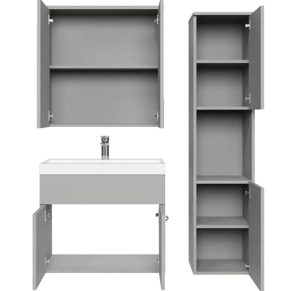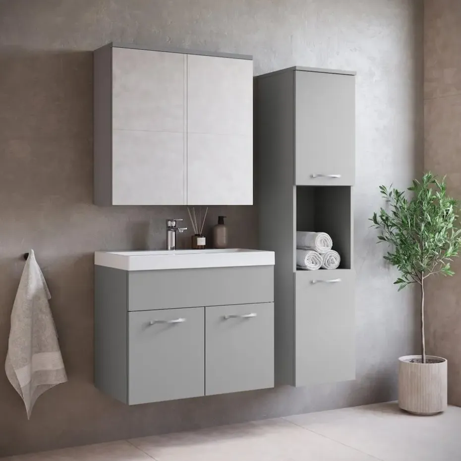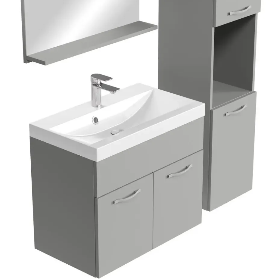 Badkamermeubel set Montreal inclusief, wastafel en spiegelkast en kolomkast.Vanwege zijn strakke afwerking is het meubel gemakkelijk schoon te maken.De set is uitgevoerd in mat grijs en is gemakkelijk te monteren.