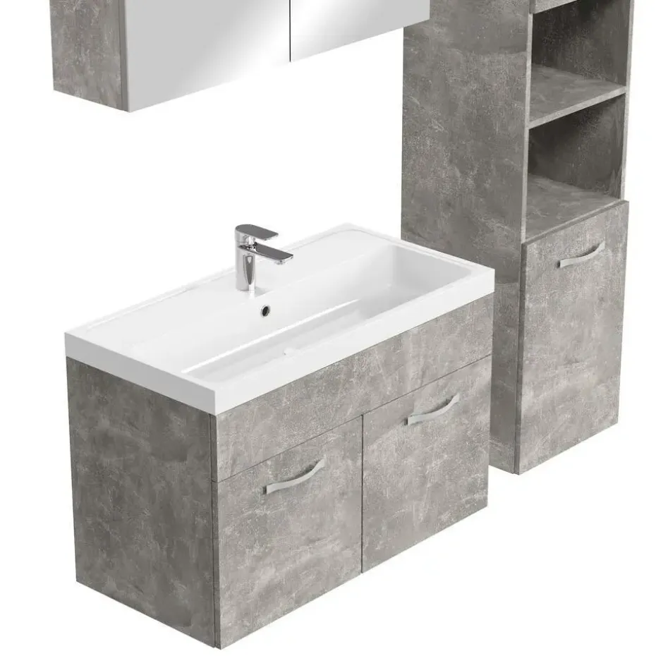 Badkamermeubel set Paso XL inclusief, wastafel en spiegelkast en twee kolomkasten.Vanwege zijn strakke afwerking is het meubel gemakkelijk schoon te maken.De set is uitgevoerd in beton grijs en is gemakkelijk te monteren. De spiegelkast en zijkasten zijn uitgevoerd met LED verlichting.