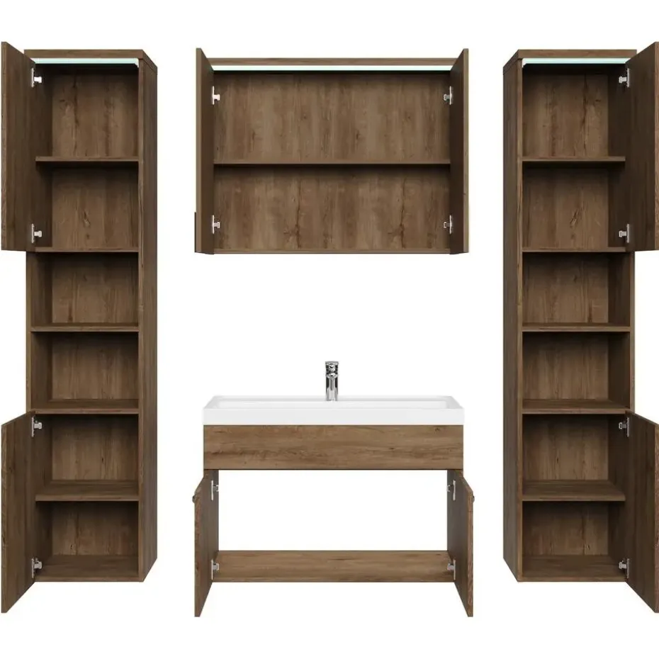 Badkamermeubel set Paso XL inclusief, wastafel en spiegelkast en twee kolomkasten.Vanwege zijn strakke afwerking is het meubel gemakkelijk schoon te maken.De set is uitgevoerd in bruin eiken en is gemakkelijk te monteren. De spiegelkast en zijkasten zijn uitgevoerd met LED verlichting.