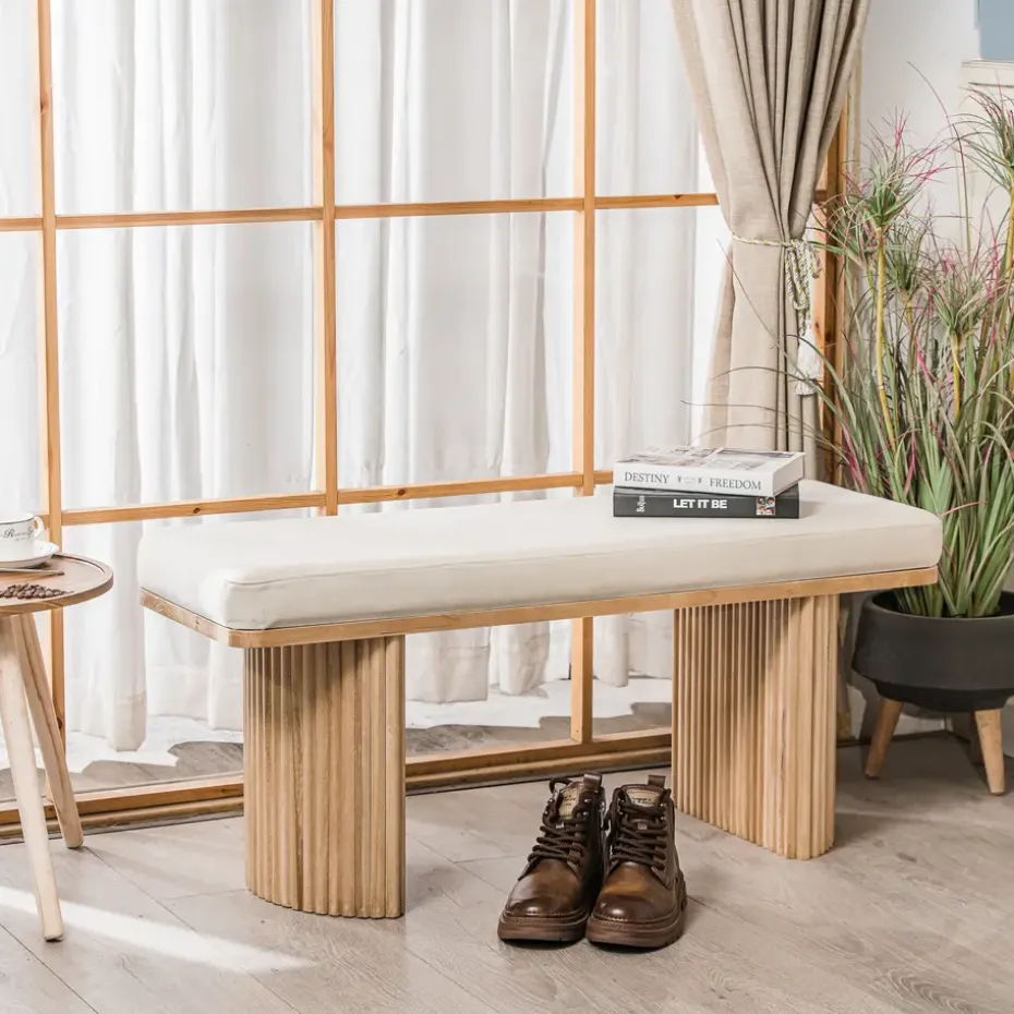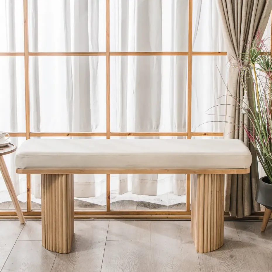 De Banc Entrée Chambre Scandinave Bois velours beige is een prachtige toevoeging aan uw interieur. Met zijn strakke Scandinavische design past hij perfect in elke kamer, of het nu de slaapkamer, kantoor, woonkamer of entree is. De ronde zitting van massief hout biedt een hoog comfort. De stevige structuur van gecertificeerd FSC essenhout zorgt voor stabiliteit en duurzaamheid. Dit product is gemakkelijk te onderhouden, een vochtige doek is voldoende om het schoon te maken.