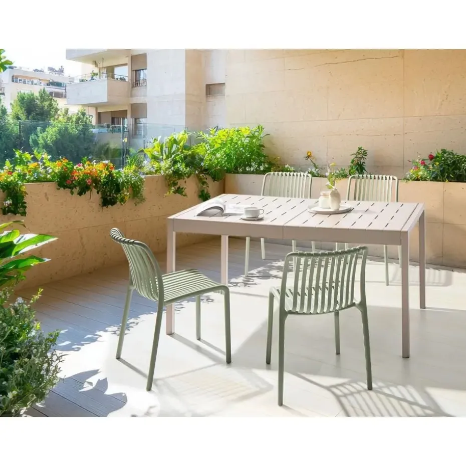 Belangrijkste eigenschappen: Modern terras- en tuinmeubilair, Weersbestendig en vuilafstotend materiaal, Roestvrijstalen frame, UV-bestendigheidsklasse, Uitzonderlijk onderhoudsvriendelijk, Beschermdoppen voor oppervlaktebescherming