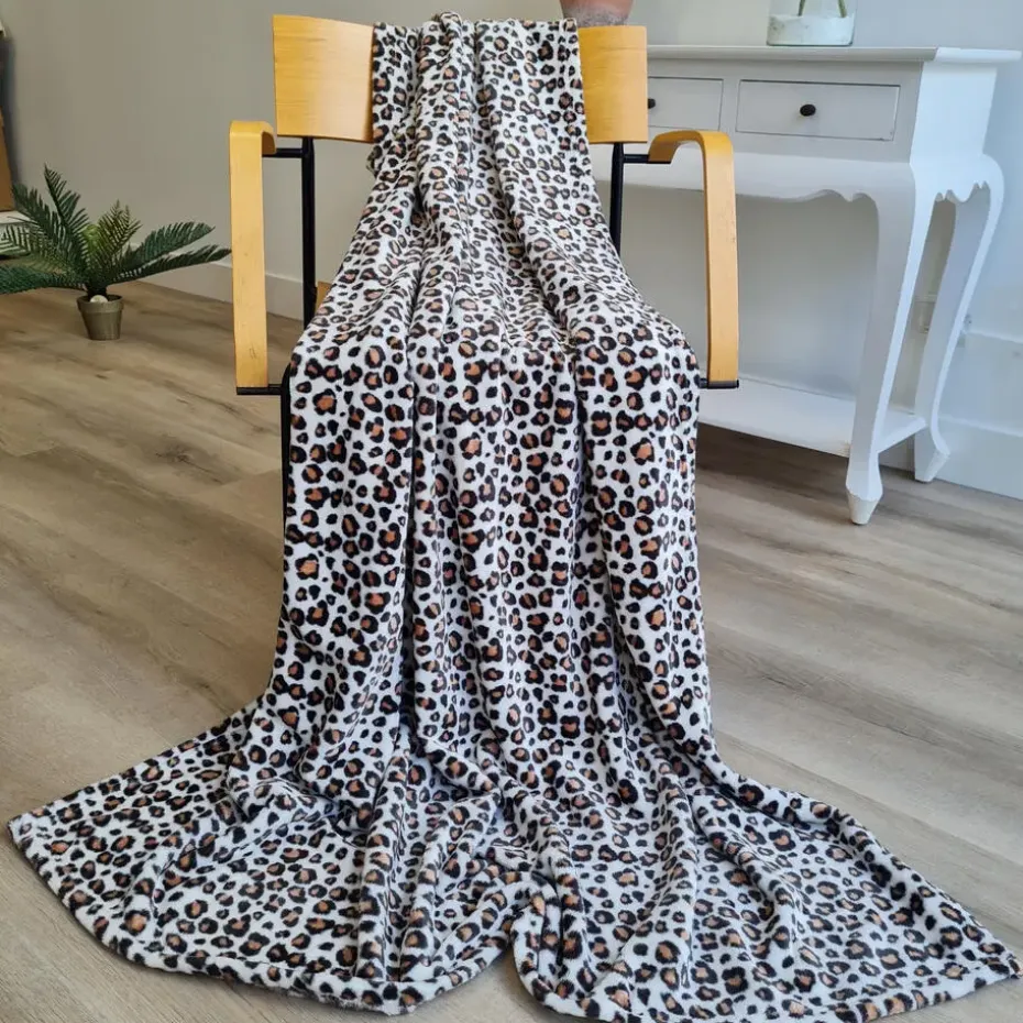 Fleece plaid/deken met mooie luipaard dieren print van 120 x 160 cm. Plaid/deken/kleed van zeer zachte fleece, ook wel coral/ teddy/ knuffel/ fluffy of mickey fleece genoemd. Heerlijk zacht kleedje om je warm te houden. Ook leuk als bedsprei, of hang hem over de armleuning van je bank of fauteuil. Materiaal: polyester, 200 grams. Formaat: 120 x 160 cm. Wasvoorschrift: 40 graden machinewas.