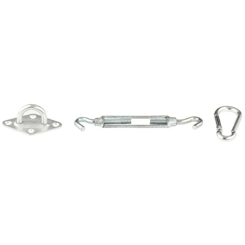 Het doek is heel gemakkelijk zelf te installeren met deze 3-delige set bestaande uit 1x karabijnhaak, 1x spanmoer en 1x plaatje met oog.