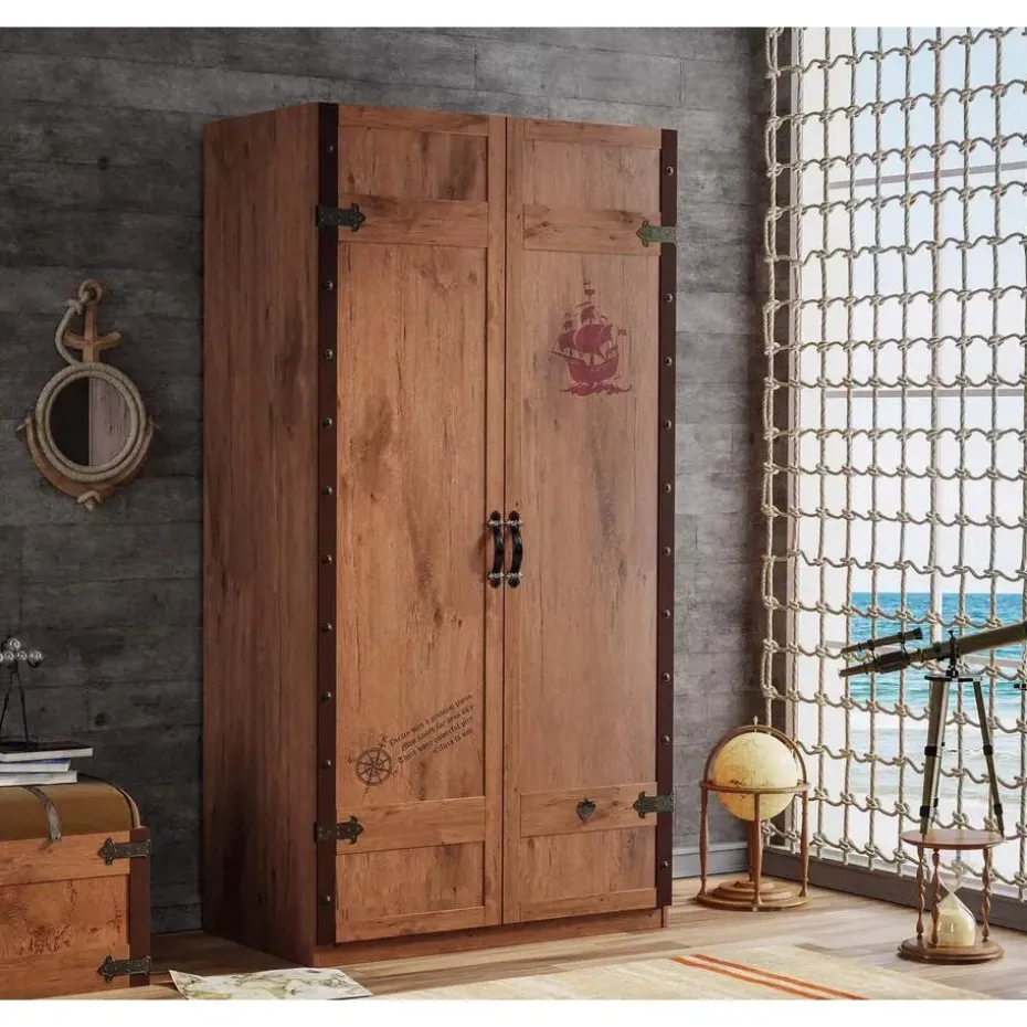 De Black Pirate 2-deurs kledingkast is een stoere en luxe kast uit de piraten themakamer. De kast is afgewerkt met een robuuste gebrande hout look en voorzien van coole piratenprenten. Dankzij het hoogwaardige ontwerp en het softclose systeem is deze kast niet alleen functioneel maar ook een echte eyecatcher in de kinderkamer.