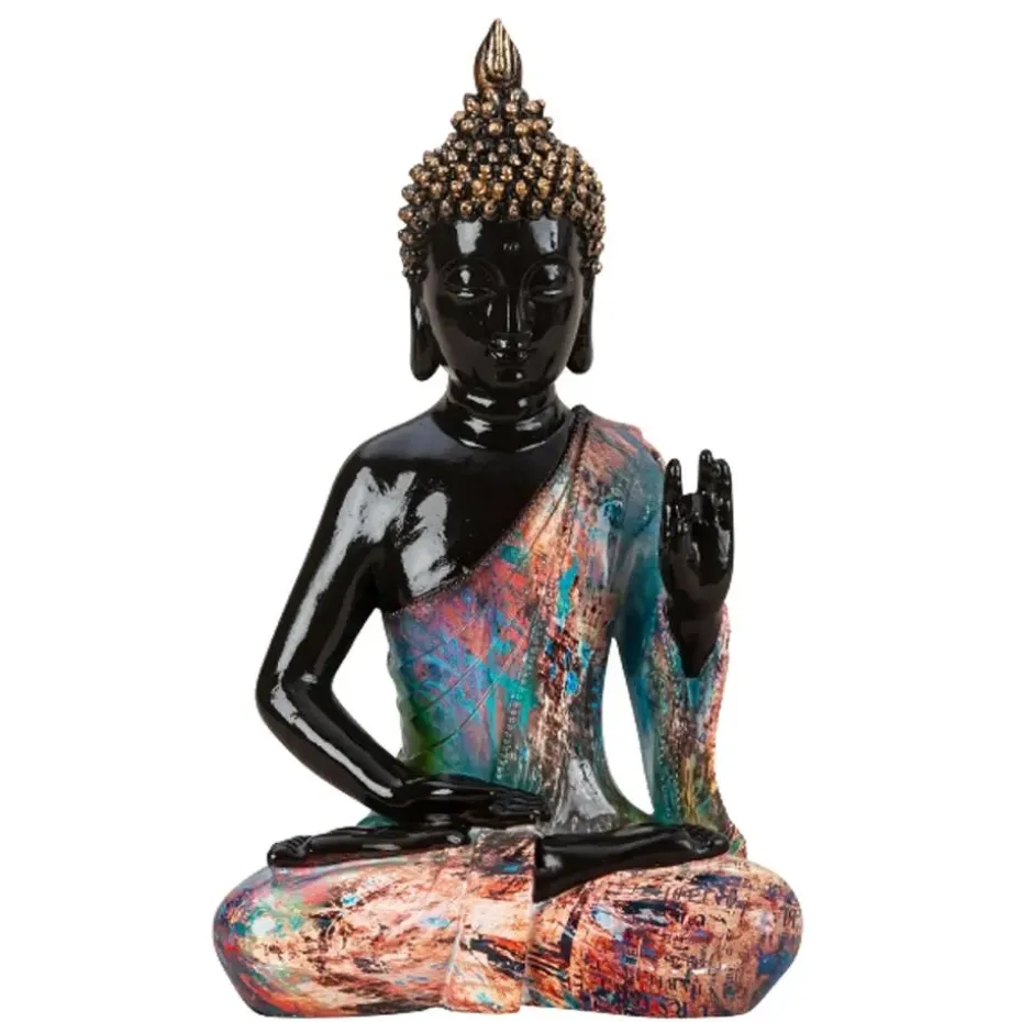 Boeddha decoratie beeld Colorfull, zittend in meditatie houding, voor huis of tuin gemaakt van polyresin kunststeen met gelakte finish zodat pure kunst is, met afmetingen van ongeveer 18 x 31 cm. Geschikt voor binnen en buiten. Kleur: zwart/kleurenmix. Dit boeddha beeld past goed in tuin/interieur en straalt rust en beheersing uit, en is gewoon mooi. U wordt er rustig/relaxed van als u er naar kijkt. Boeddha woon/tuinaccessoires beelden zijn ook zeer geschikt als cadeau.