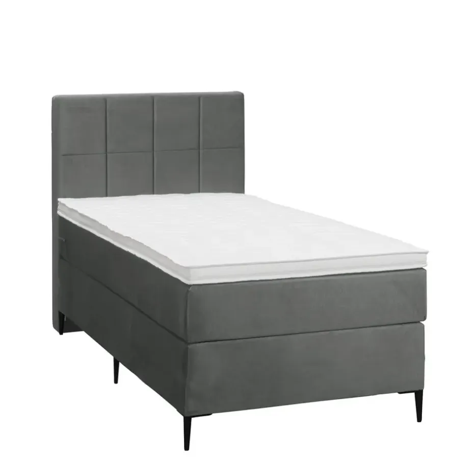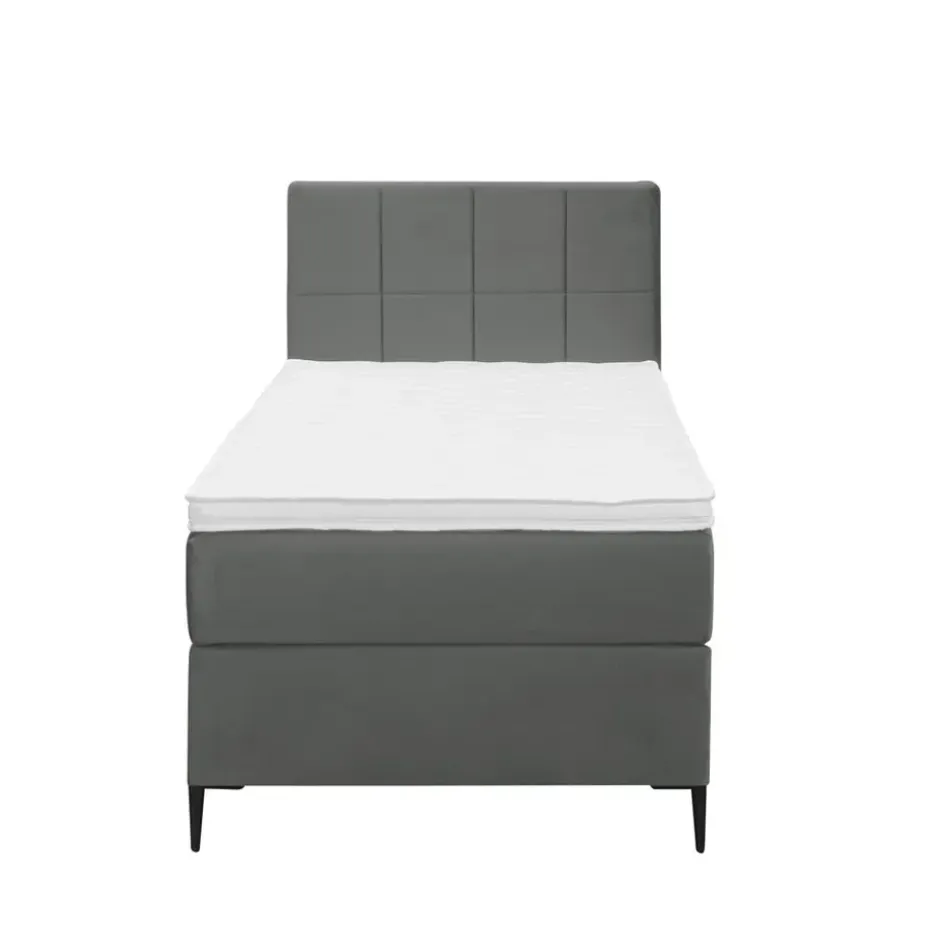 Boxspring Liv is een boxspring met een afmeting van 90×200 cm. Deze prachtige boxspring is bekleed met een velvet grijze stof en heeft een landelijke uitstraling met een geblokt hoofdbord. De Liv geblokt is uitgerust met een pocketveringmatras en daarnaast ook nog een koudschuim topdekmatras voor extra comfort. Het pocketveringmatras is omkeerbaar, bestaande uit zowel een medium- als een stevige kant. Hierdoor kun je zelf kiezen wat voor jou het meest comfortabel ligt.