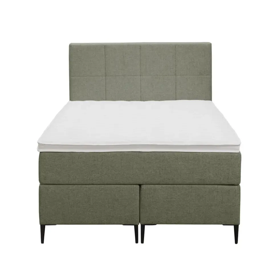 Boxspring Liv is een boxspring met een afmeting van 120×200 cm. Deze prachtige boxspring is bekleed met een fijn geweven groene stof en heeft een landelijke uitstraling met een geblokt hoofdbord. De Liv geblokt is uitgerust met een pocketveringmatras en daarnaast ook nog een koudschuim topdekmatras voor extra comfort. Het pocketveringmatras is omkeerbaar, bestaande uit zowel een medium- als een stevige kant. Hierdoor kun je zelf kiezen wat voor jou het meest comfortabel ligt.