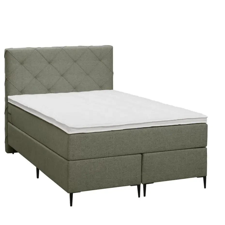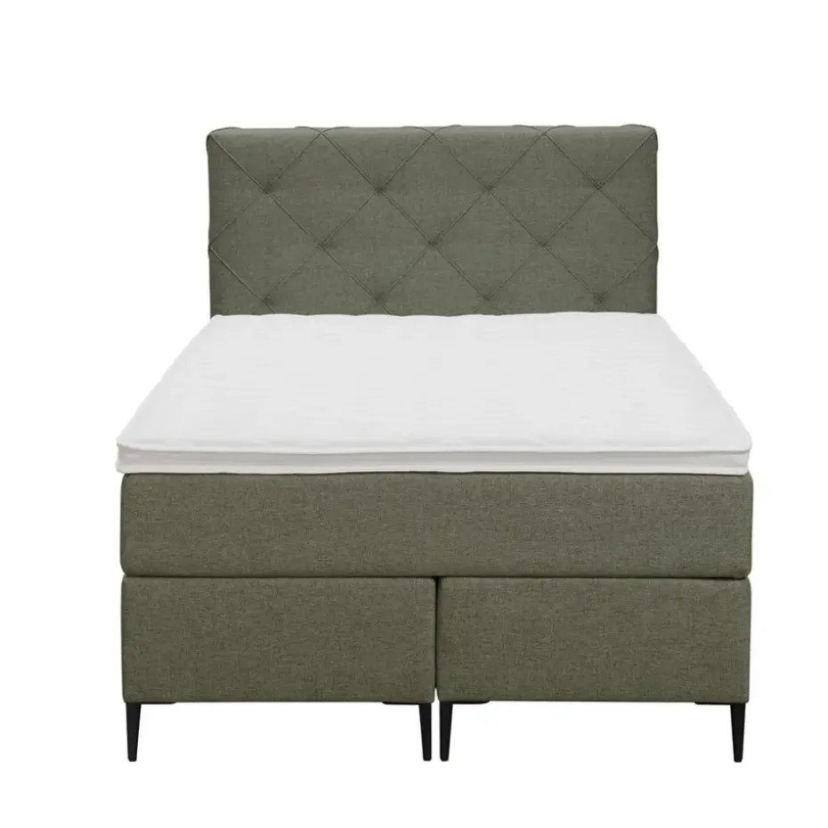 Boxspring Liv is een boxspring met een afmeting van 120×200 cm. Deze prachtige boxspring is bekleed met een fijn geweven groene stof en heeft een romantische uitstraling met een geruit hoofdbord. De Liv geruit is uitgerust met een pocketveringmatras en daarnaast ook nog een koudschuim topdekmatras voor extra comfort. Het pocketveringmatras is omkeerbaar, bestaande uit zowel een medium- als een stevige kant. Hierdoor kun je zelf kiezen wat voor jou het meest comfortabel ligt.