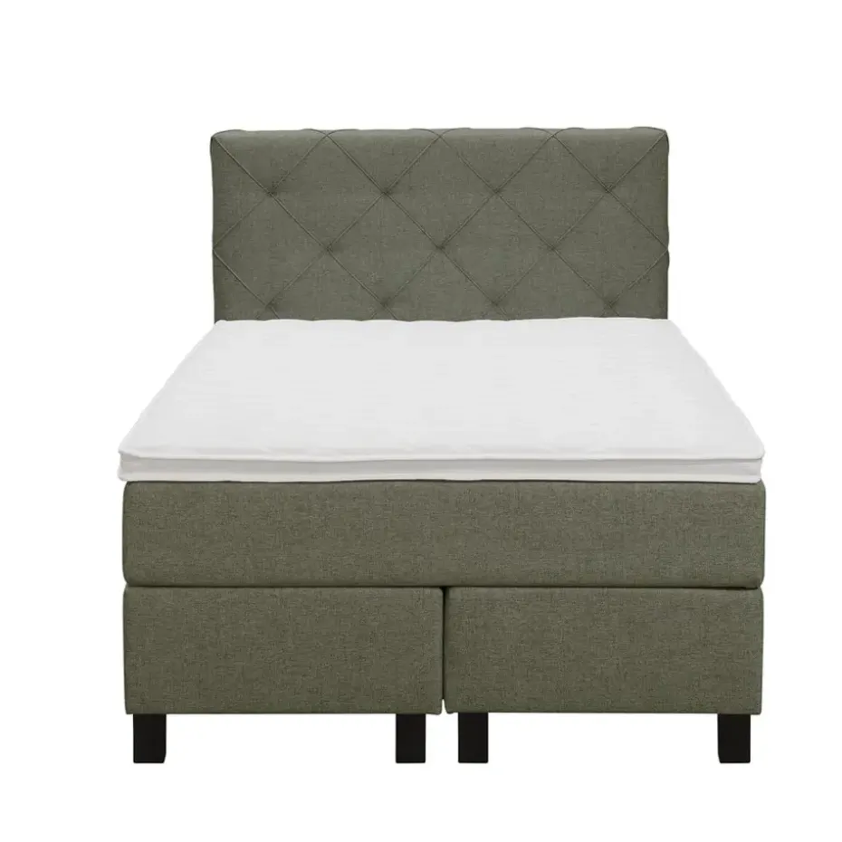 Boxspring Liv is een boxspring met een afmeting van 120×200 cm. Deze prachtige boxspring is bekleed met een fijn geweven groene stof en heeft een romantische uitstraling met een geruit hoofdbord. De Liv geruit is uitgerust met een pocketveringmatras en daarnaast ook nog een koudschuim topdekmatras voor extra comfort. Het pocketveringmatras is omkeerbaar, bestaande uit zowel een medium- als een stevige kant. Hierdoor kun je zelf kiezen wat voor jou het meest comfortabel ligt.