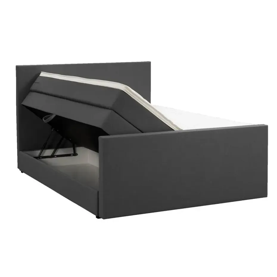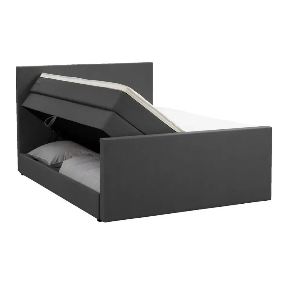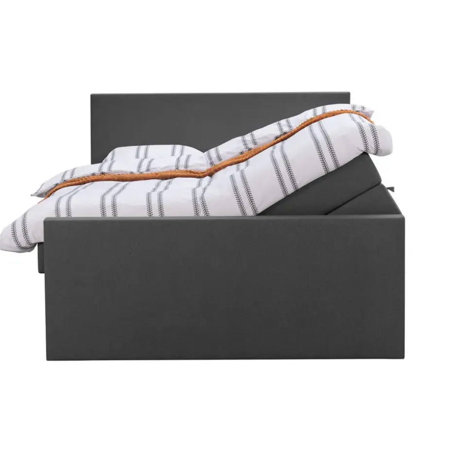 Boxspring met opbergruimte Liv is een boxspring met een afmeting van 180×200 cm. Deze prachtige boxspring is bekleed met een grof geweven antraciete stof en heeft een strakke uitstraling met een egaal hoofd- en voetbord. De Liv egaal is uitgerust met twee pocketveringmatrassen en daarnaast ook nog een koudschuim topdekmatras voor extra comfort. Het pocketveringmatras is omkeerbaar, bestaande uit zowel een medium- als een stevige kant. Hierdoor kun je zelf kiezen wat voor jou het meest comfortabel ligt.