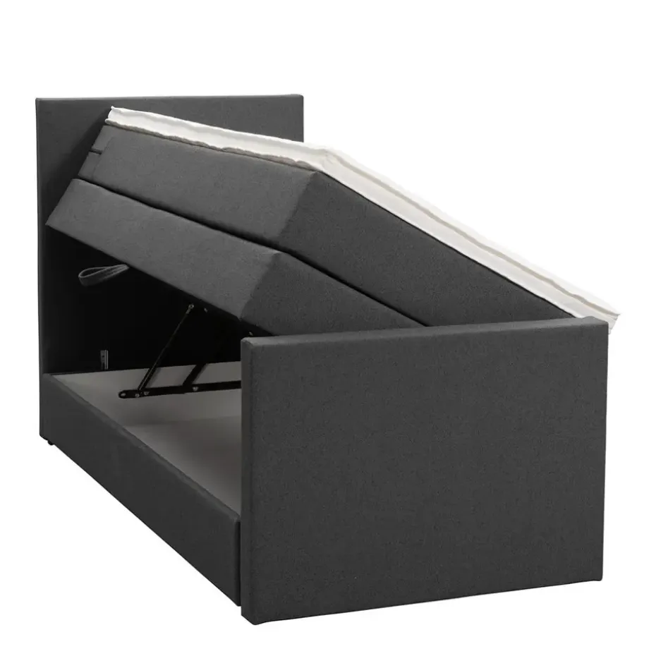 Boxspring met opbergruimte Liv is een boxspring met een afmeting van 90×200 cm. Deze prachtige boxspring is bekleed met een grof geweven antraciete stof en heeft een strakke uitstraling met een egaal hoofd- en voetbord. De Liv egaal is uitgerust met een pocketveringmatras en daarnaast ook nog een koudschuim topdekmatras voor extra comfort. Het pocketveringmatras is omkeerbaar, bestaande uit zowel een medium- als een stevige kant. Hierdoor kun je zelf kiezen wat voor jou het meest comfortabel ligt.