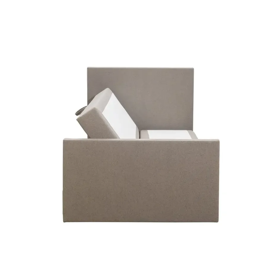 Boxspring met opbergruimte Liv is een boxspring met een afmeting van 120×200 cm. Deze prachtige boxspring is bekleed met een grof geweven beige stof en heeft een strakke uitstraling met een egaal hoofd- en voetbord. De Liv egaal is uitgerust met een pocketveringmatras en daarnaast ook nog een koudschuim topdekmatras voor extra comfort. Het pocketveringmatras is omkeerbaar, bestaande uit zowel een medium- als een stevige kant. Hierdoor kun je zelf kiezen wat voor jou het meest comfortabel ligt.