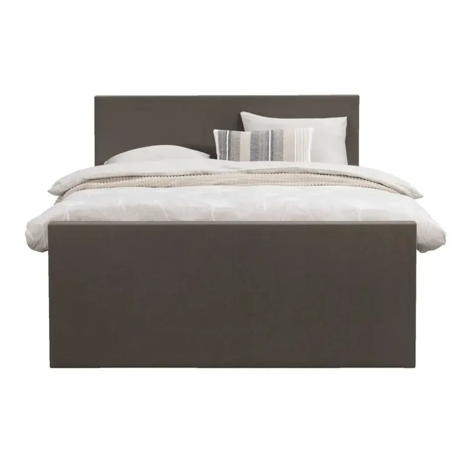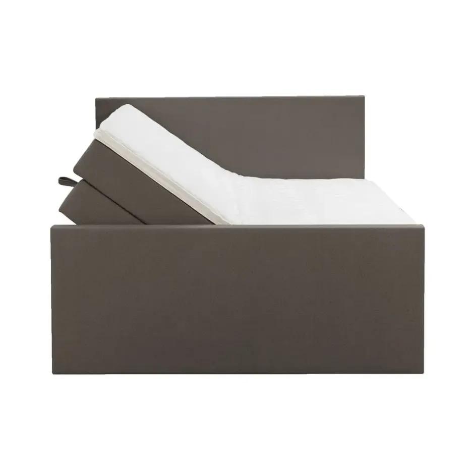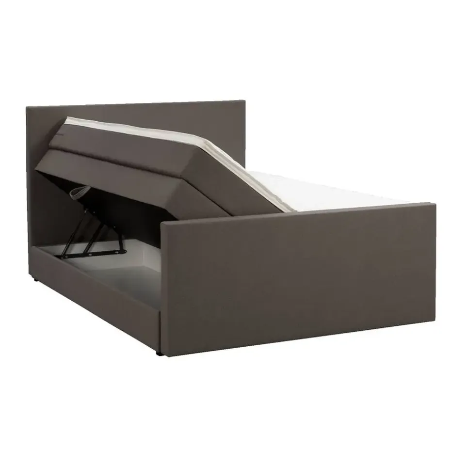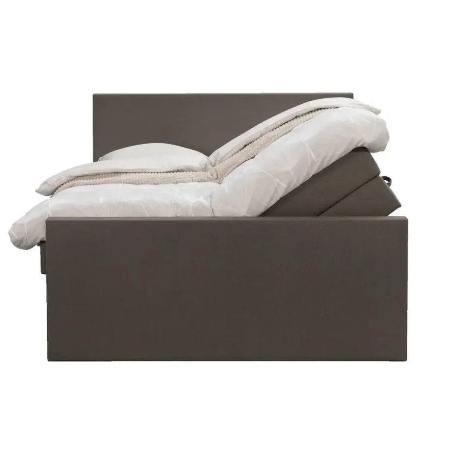 Boxspring met opbergruimte Liv is een boxspring met een afmeting van 140×200 cm. Deze prachtige boxspring is bekleed met een grof geweven donkerbruine stof en heeft een strakke uitstraling met een egaal hoofd- en voetbord. De Liv egaal is uitgerust met een pocketveringmatras en daarnaast ook nog een koudschuim topdekmatras voor extra comfort. Het pocketveringmatras is omkeerbaar, bestaande uit zowel een medium- als een stevige kant. Hierdoor kun je zelf kiezen wat voor jou het meest comfortabel ligt.