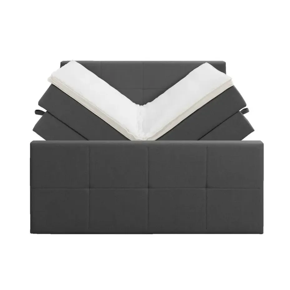 Boxspring met opbergruimte Liv is een boxspring met een afmeting van 180×200 cm. Deze prachtige boxspring is bekleed met een grof geweven antraciete stof en heeft een landelijke uitstraling met een geblokt hoofd- en voetbord. De Liv geblokt is uitgerust met twee pocketveringmatrassen en daarnaast ook nog een koudschuim topdekmatras voor extra comfort. Het pocketveringmatras is omkeerbaar, bestaande uit zowel een medium- als een stevige kant. Hierdoor kun je zelf kiezen wat voor jou het meest comfortabel ligt.