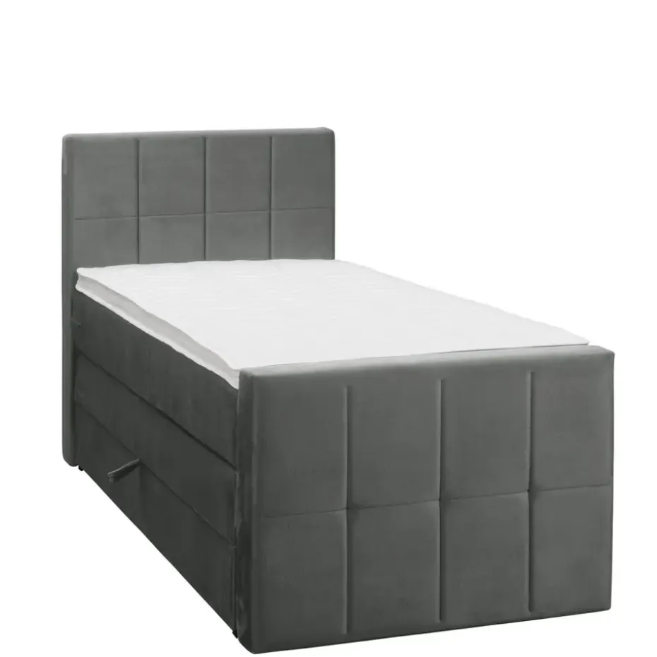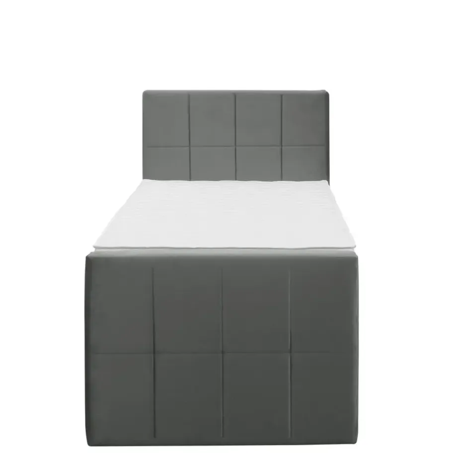 Boxspring met opbergruimte Liv is een boxspring met een afmeting van 90×200 cm. Deze prachtige boxspring is bekleed met een velvet grijze stof en heeft een landelijke uitstraling met een geblokt hoofd- en voetbord. De Liv geblokt is uitgerust met een pocketveringmatras en daarnaast ook nog een koudschuim topdekmatras voor extra comfort. Het pocketveringmatras is omkeerbaar, bestaande uit zowel een medium- als een stevige kant. Hierdoor kun je zelf kiezen wat voor jou het meest comfortabel ligt.