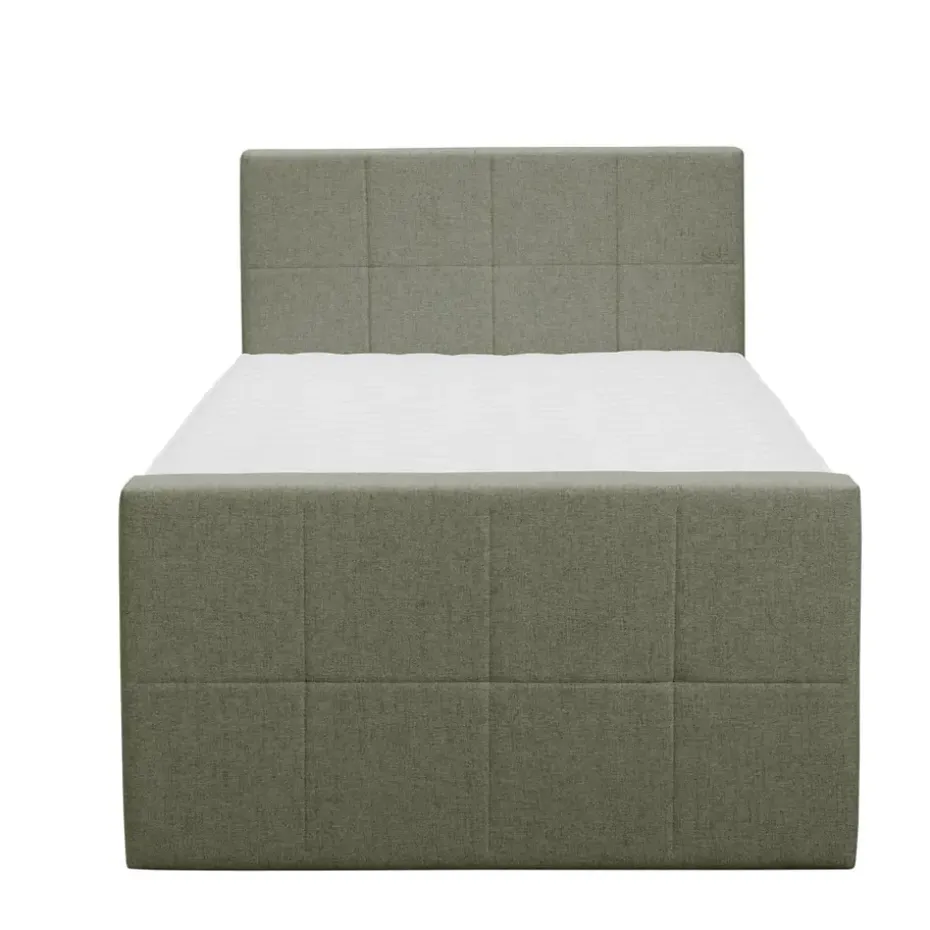 Boxspring met opbergruimte Liv is een boxspring met een afmeting van 120×200 cm. Deze prachtige boxspring is bekleed met een fijn geweven groene stof en heeft een landelijke uitstraling met een geblokt hoofd- en voetbord. De Liv geblokt is uitgerust met een pocketveringmatras en daarnaast ook nog een koudschuim topdekmatras voor extra comfort. Het pocketveringmatras is omkeerbaar, bestaande uit zowel een medium- als een stevige kant. Hierdoor kun je zelf kiezen wat voor jou het meest comfortabel ligt.