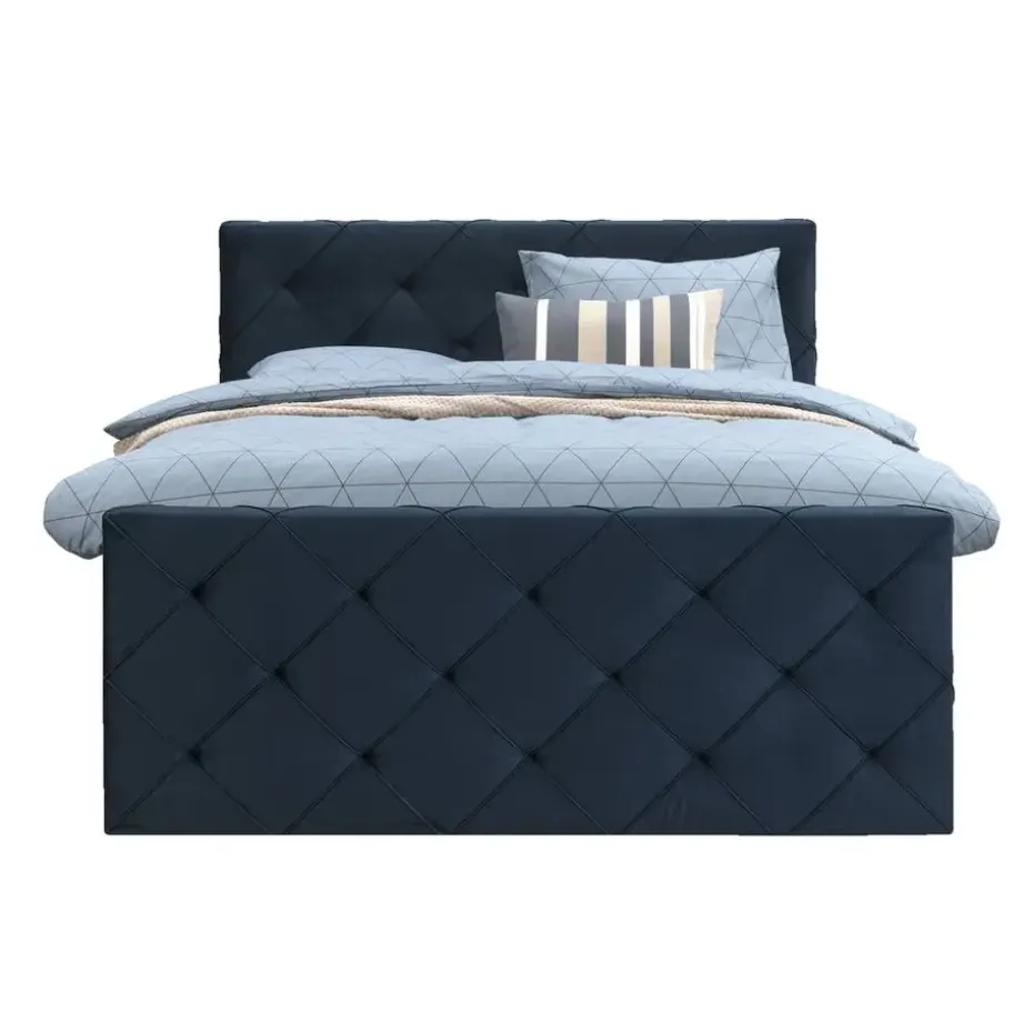 Boxspring met opbergruimte Liv is een boxspring met een afmeting van 180×200 cm. Deze prachtige boxspring is bekleed met een velvet blauwe stof en heeft een romantische uitstraling met een geruit hoofd- en voetbord. De Liv geruit is uitgerust met twee pocketveringmatrassen en daarnaast ook nog een koudschuim topdekmatras voor extra comfort. Het pocketveringmatras is omkeerbaar, bestaande uit zowel een medium- als een stevige kant. Hierdoor kun je zelf kiezen wat voor jou het meest comfortabel ligt.
