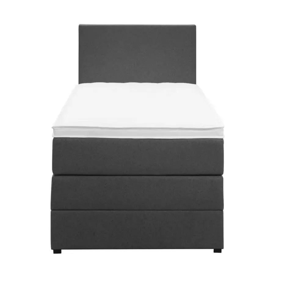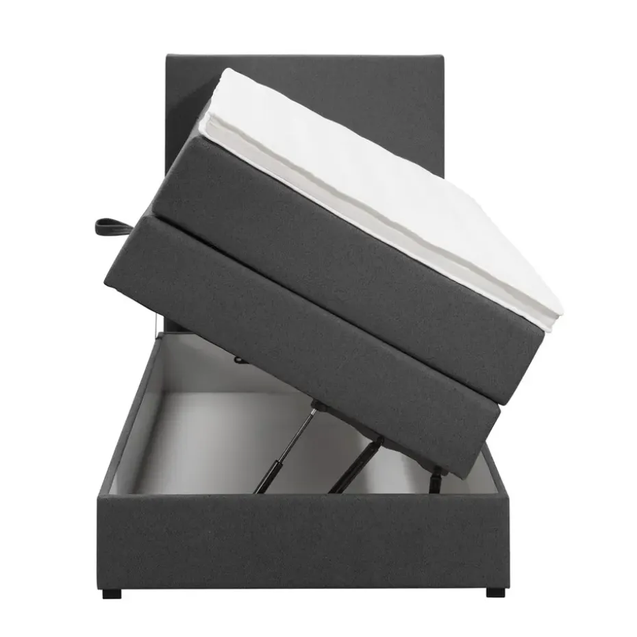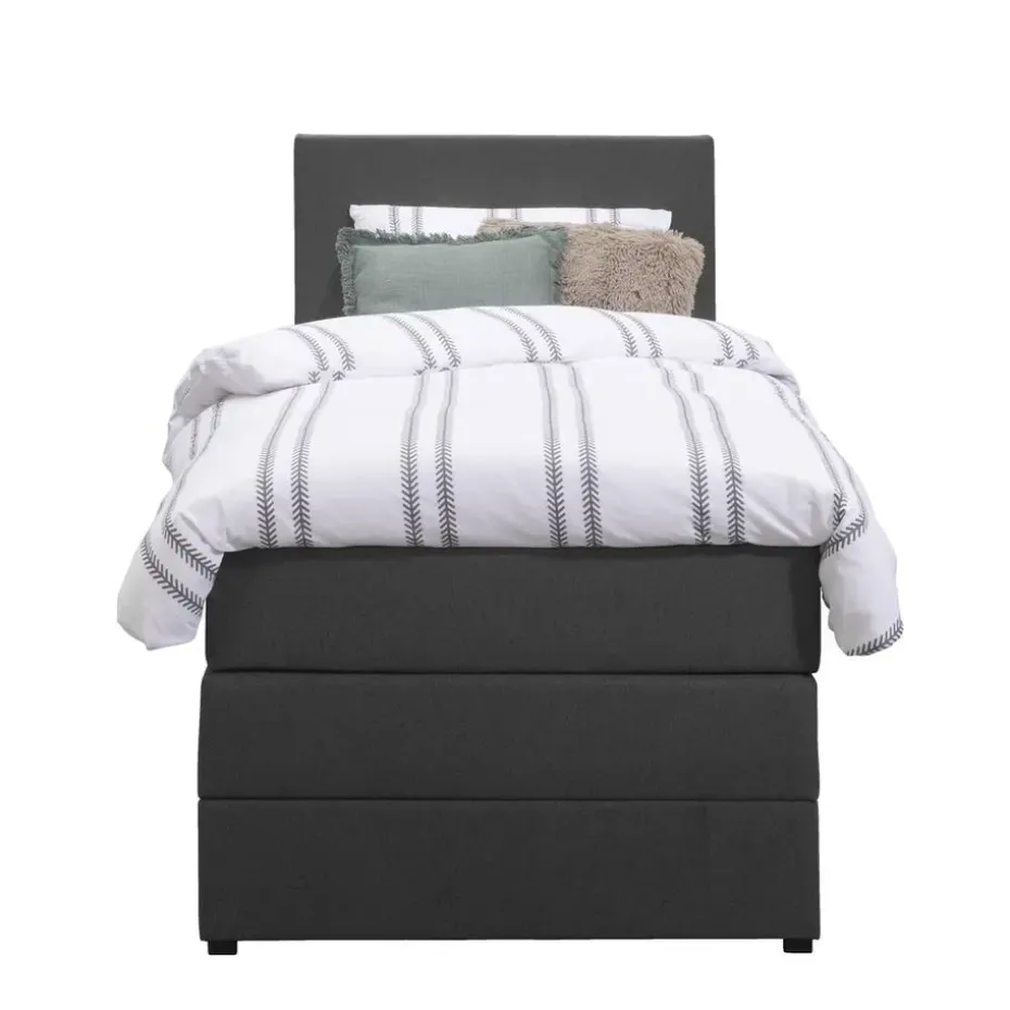 Boxspring met opbergruimte Liv is een boxspring met een afmeting van 90×200 cm. Deze prachtige boxspring is bekleed met een grof geweven antraciete stof en heeft een strakke uitstraling met een egaal hoofdbord. De Liv egaal is uitgerust met een pocketveringmatras en daarnaast ook nog een koudschuim topdekmatras voor extra comfort. Het pocketveringmatras is omkeerbaar, bestaande uit zowel een medium- als een stevige kant. Hierdoor kun je zelf kiezen wat voor jou het meest comfortabel ligt.