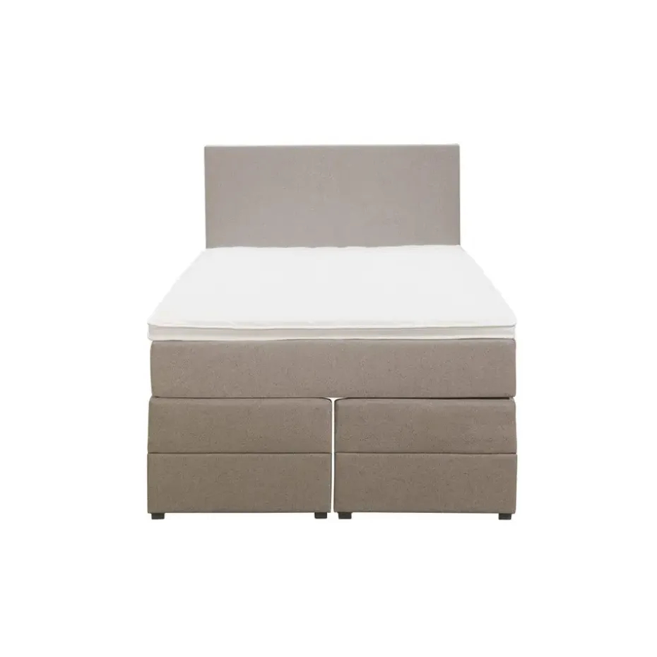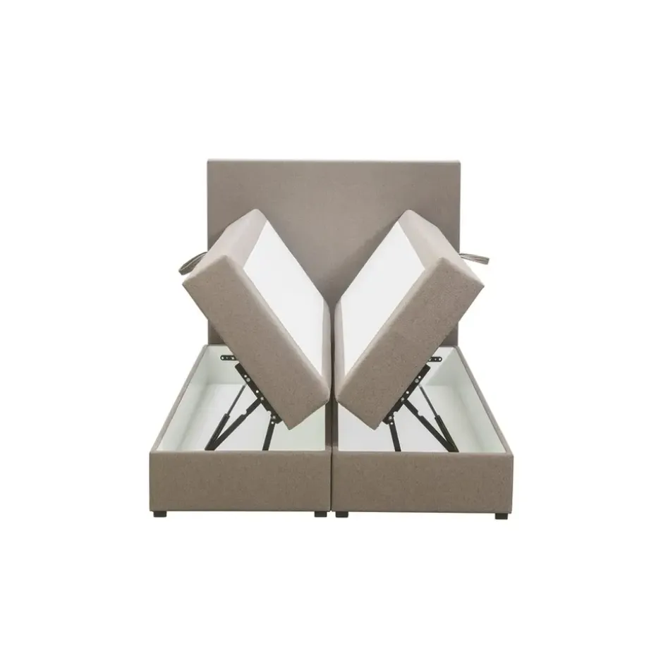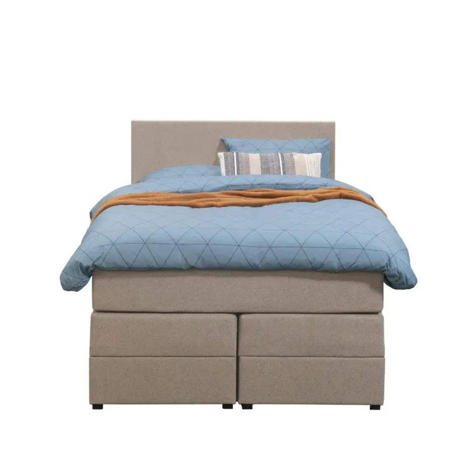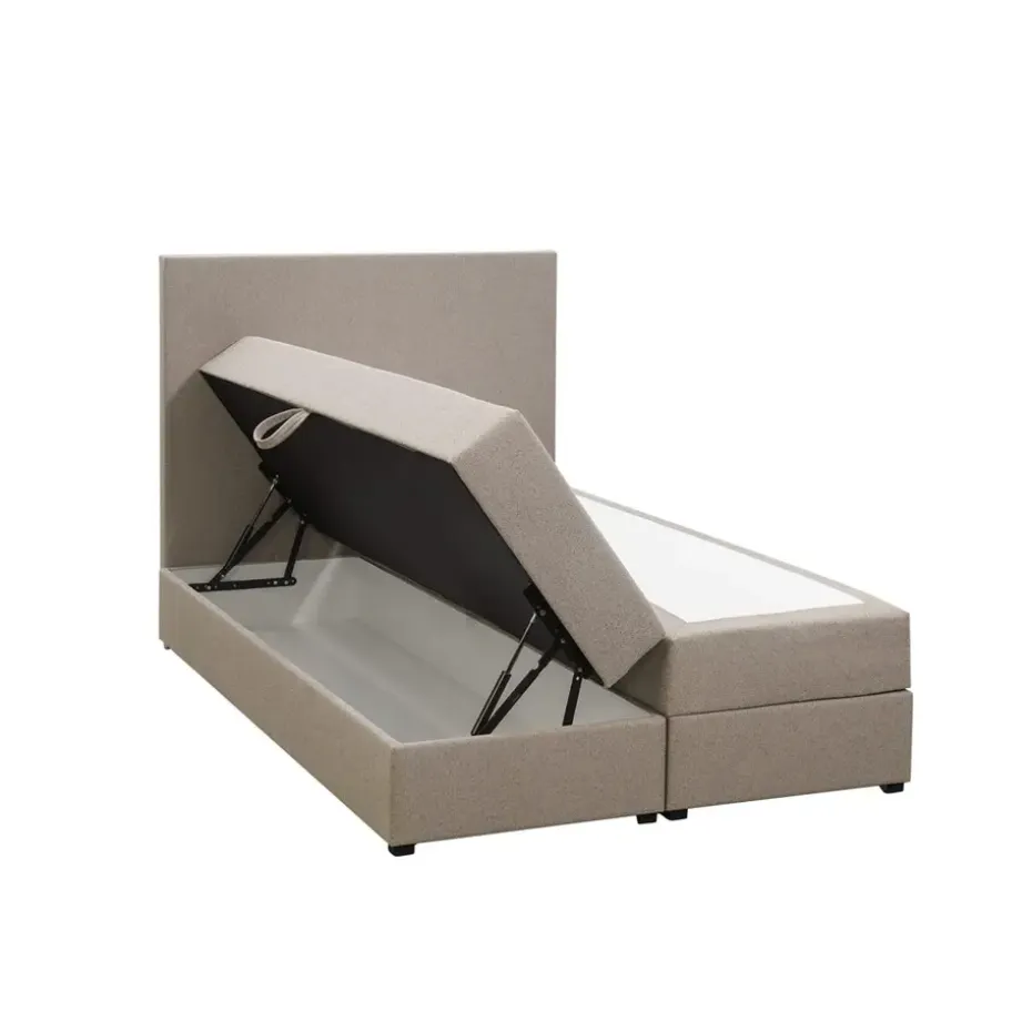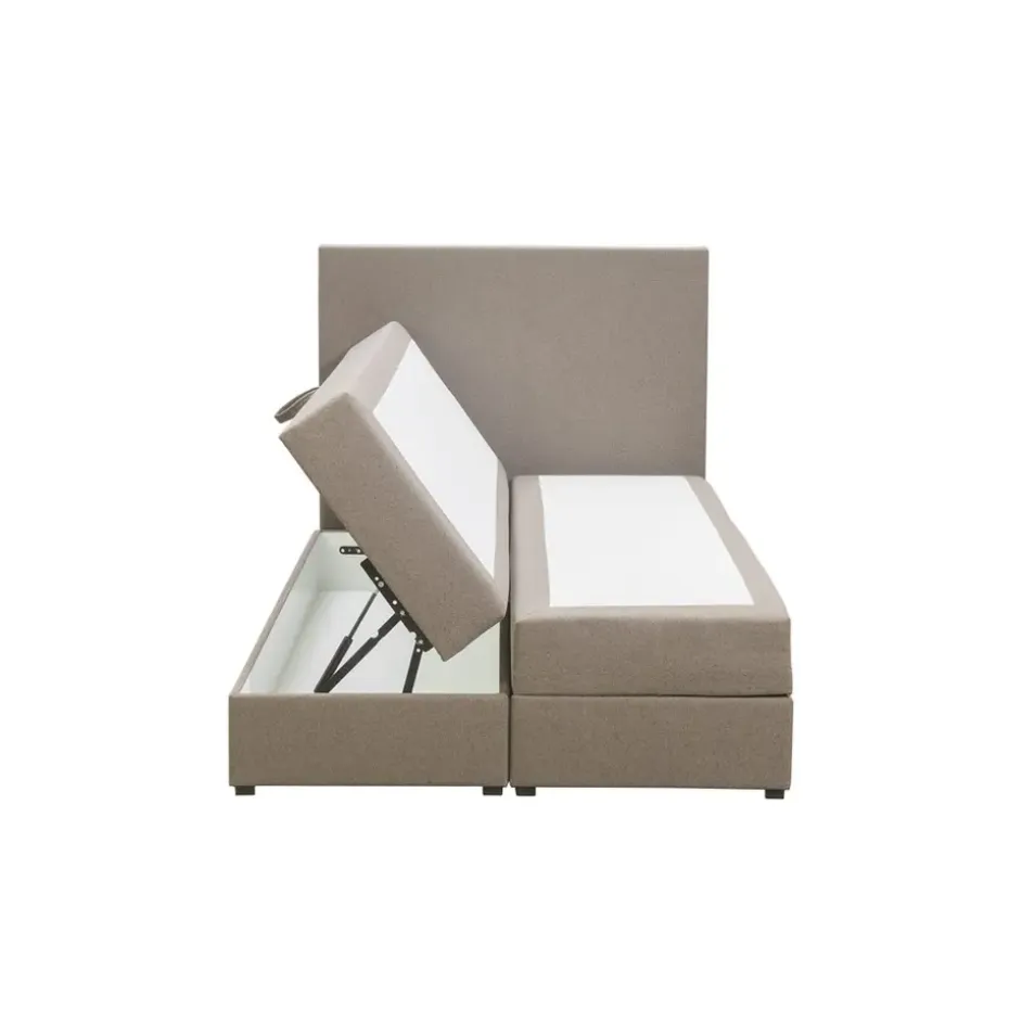 Boxspring met opbergruimte Liv is een boxspring met een afmeting van 120×200 cm. Deze prachtige boxspring is bekleed met een grof geweven beige stof en heeft een strakke uitstraling met een egaal hoofdbord. De Liv egaal is uitgerust met een pocketveringmatras en daarnaast ook nog een koudschuim topdekmatras voor extra comfort. Het pocketveringmatras is omkeerbaar, bestaande uit zowel een medium- als een stevige kant. Hierdoor kun je zelf kiezen wat voor jou het meest comfortabel ligt.