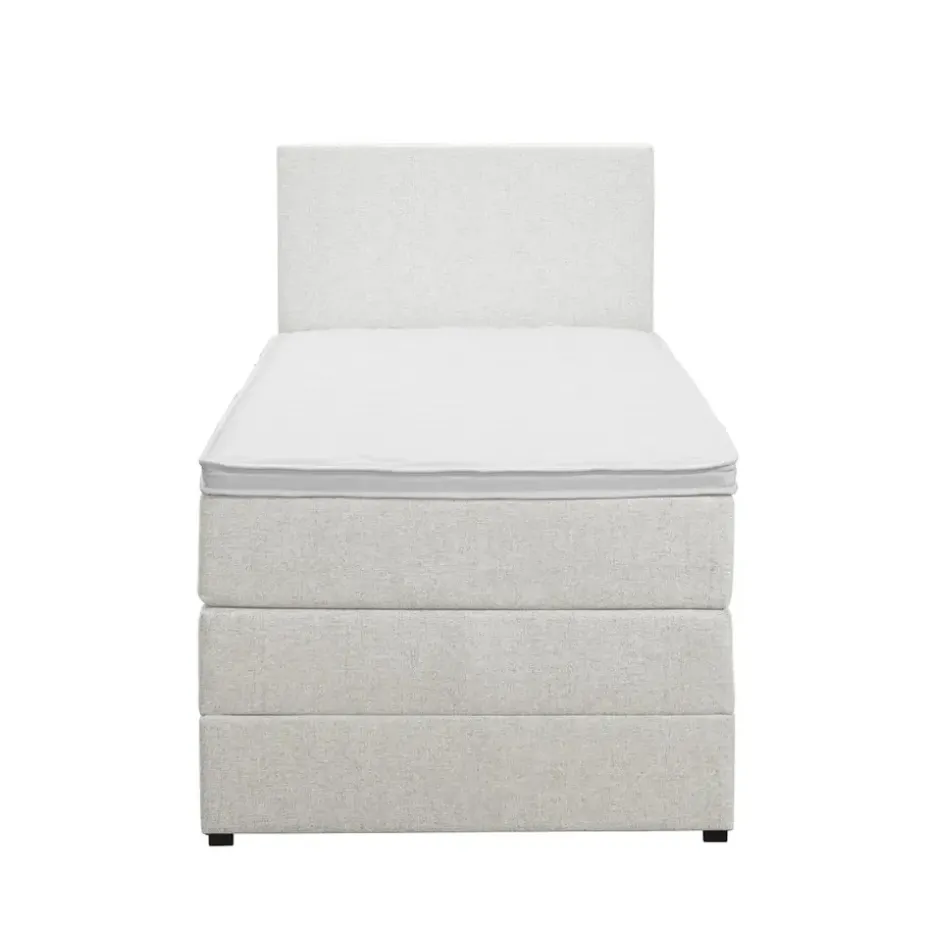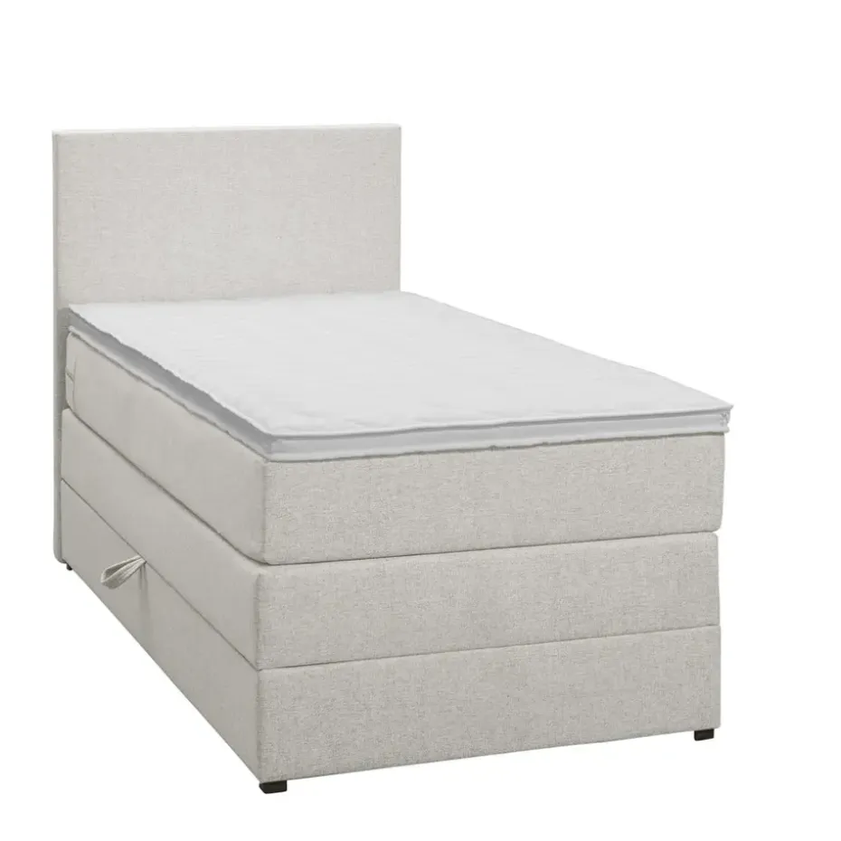 Boxspring met opbergruimte Liv is een boxspring met een afmeting van 90×200 cm. Deze prachtige boxspring is bekleed met een fijn geweven ecru stof en heeft een strakke uitstraling met een egaal hoofdbord. De Liv egaal is uitgerust met een pocketveringmatras en daarnaast ook nog een koudschuim topdekmatras voor extra comfort. Het pocketveringmatras is omkeerbaar, bestaande uit zowel een medium- als een stevige kant. Hierdoor kun je zelf kiezen wat voor jou het meest comfortabel ligt.