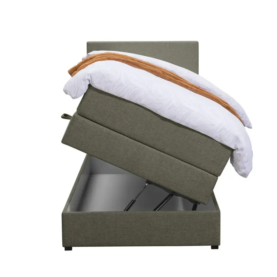 Boxspring met opbergruimte Liv is een boxspring met een afmeting van 90×200 cm. Deze prachtige boxspring is bekleed met een fijn geweven groene stof en heeft een strakke uitstraling met een egaal hoofdbord. De Liv egaal is uitgerust met een pocketveringmatras en daarnaast ook nog een koudschuim topdekmatras voor extra comfort. Het pocketveringmatras is omkeerbaar, bestaande uit zowel een medium- als een stevige kant. Hierdoor kun je zelf kiezen wat voor jou het meest comfortabel ligt.