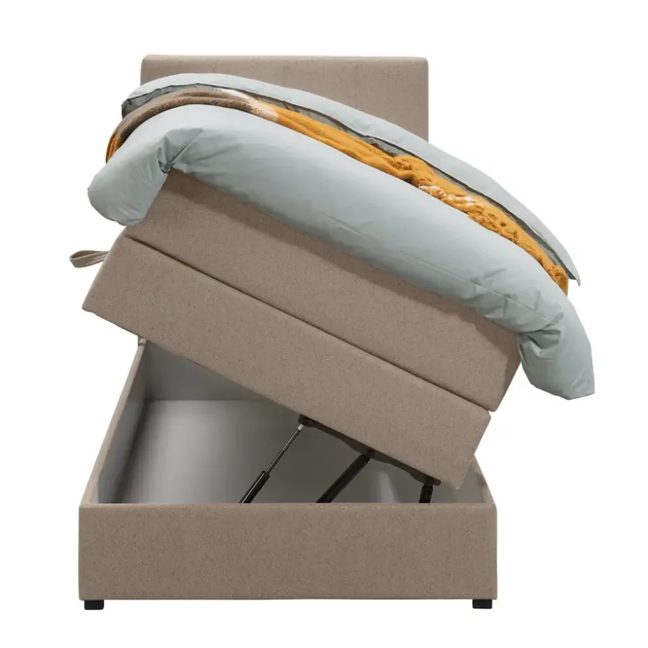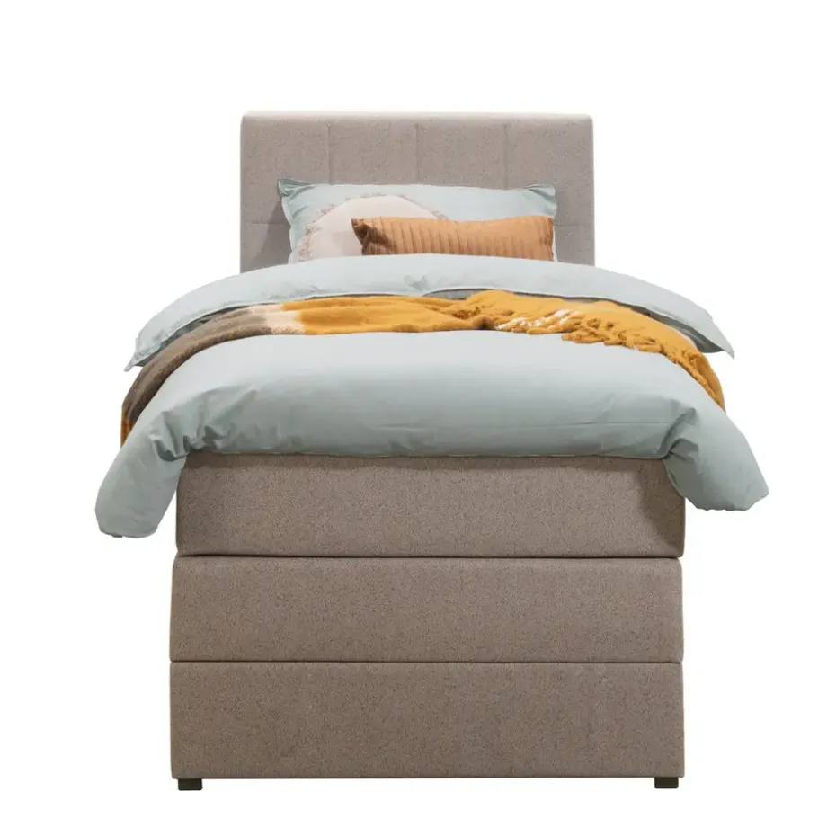 Boxspring met opbergruimte Liv is een boxspring met een afmeting van 90×200 cm. Deze prachtige boxspring is bekleed met een grof geweven beige stof en heeft een landelijke uitstraling met een geblokt hoofdbord. De Liv geblokt is uitgerust met een pocketveringmatras en daarnaast ook nog een koudschuim topdekmatras voor extra comfort. Het pocketveringmatras is omkeerbaar, bestaande uit zowel een medium- als een stevige kant. Hierdoor kun je zelf kiezen wat voor jou het meest comfortabel ligt.