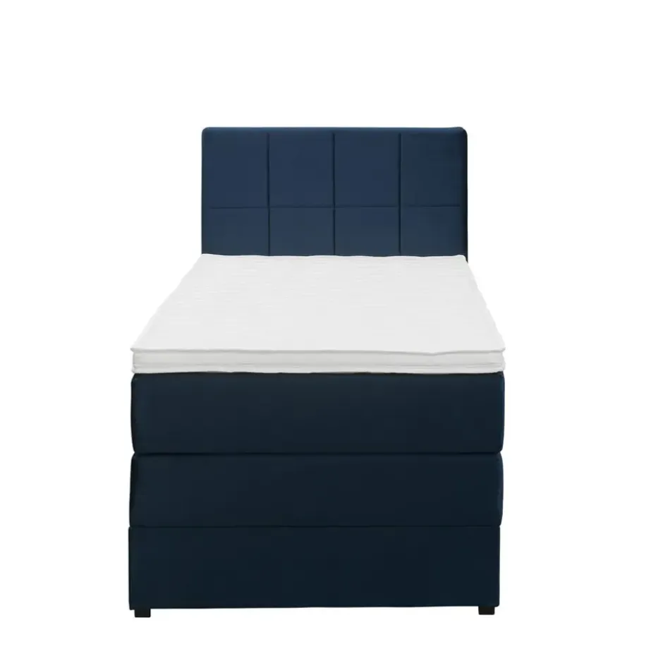 Boxspring met opbergruimte Liv is een boxspring met een afmeting van 90×200 cm. Deze prachtige boxspring is bekleed met een velvet blauwe stof en heeft een landelijke uitstraling met een geblokt hoofdbord. De Liv geblokt is uitgerust met een pocketveringmatras en daarnaast ook nog een koudschuim topdekmatras voor extra comfort. Het pocketveringmatras is omkeerbaar, bestaande uit zowel een medium- als een stevige kant. Hierdoor kun je zelf kiezen wat voor jou het meest comfortabel ligt.