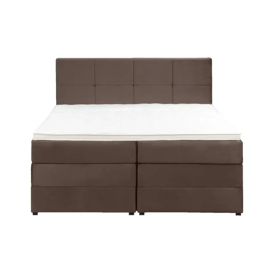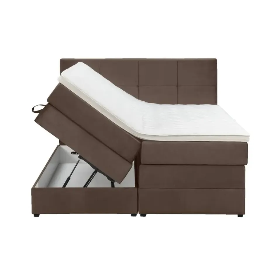 Boxspring met opbergruimte Liv is een boxspring met een afmeting van 180×200 cm. Deze prachtige boxspring is bekleed met een velvet bruine stof en heeft een landelijke uitstraling met een geblokt hoofdbord. De Liv geblokt is uitgerust met twee pocketveringmatrassen en daarnaast ook nog een koudschuim topdekmatras voor extra comfort. Het pocketveringmatras is omkeerbaar, bestaande uit zowel een medium- als een stevige kant. Hierdoor kun je zelf kiezen wat voor jou het meest comfortabel ligt.