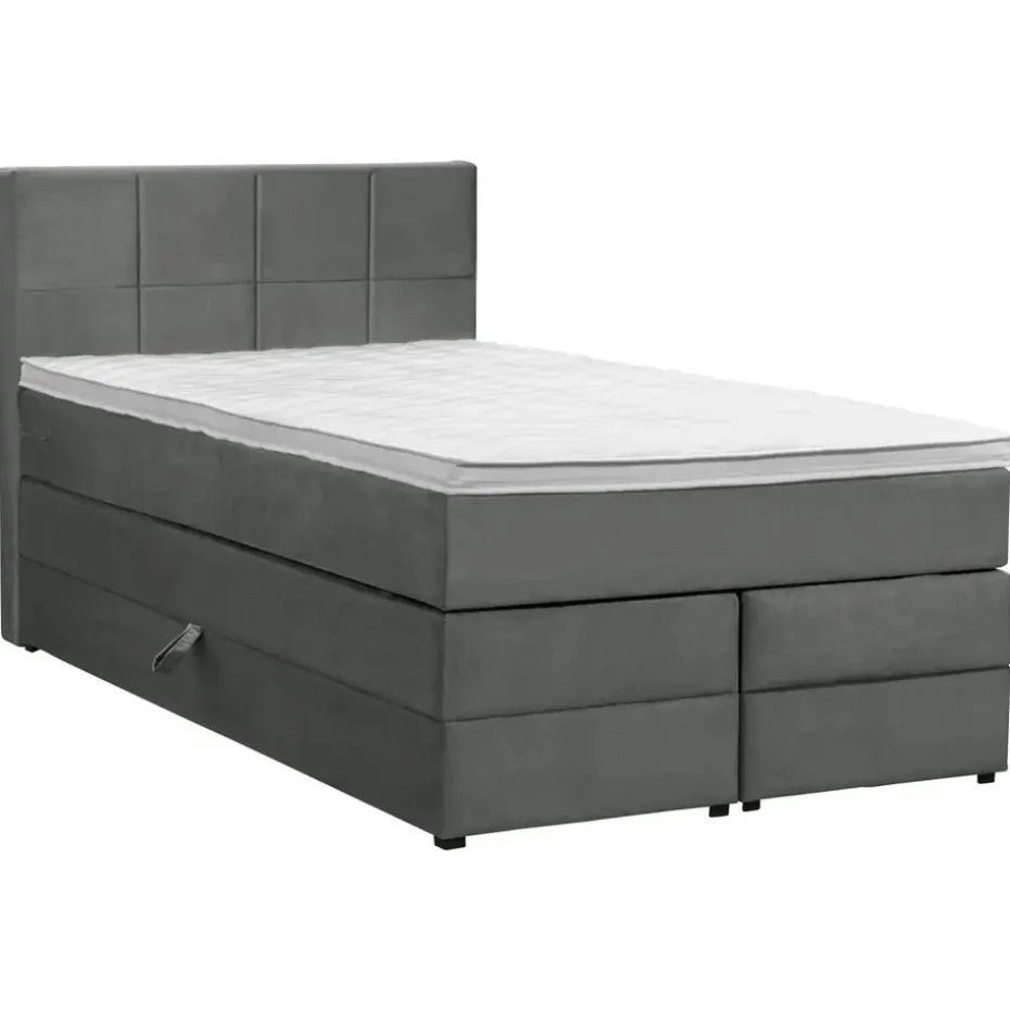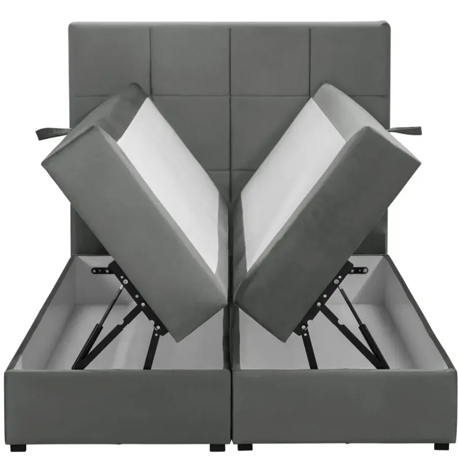 Boxspring met opbergruimte Liv is een boxspring met een afmeting van 120×200 cm. Deze prachtige boxspring is bekleed met een velvet grijze stof en heeft een landelijke uitstraling met een geblokt hoofdbord. De Liv geblokt is uitgerust met een pocketveringmatras en daarnaast ook nog een koudschuim topdekmatras voor extra comfort. Het pocketveringmatras is omkeerbaar, bestaande uit zowel een medium- als een stevige kant. Hierdoor kun je zelf kiezen wat voor jou het meest comfortabel ligt.