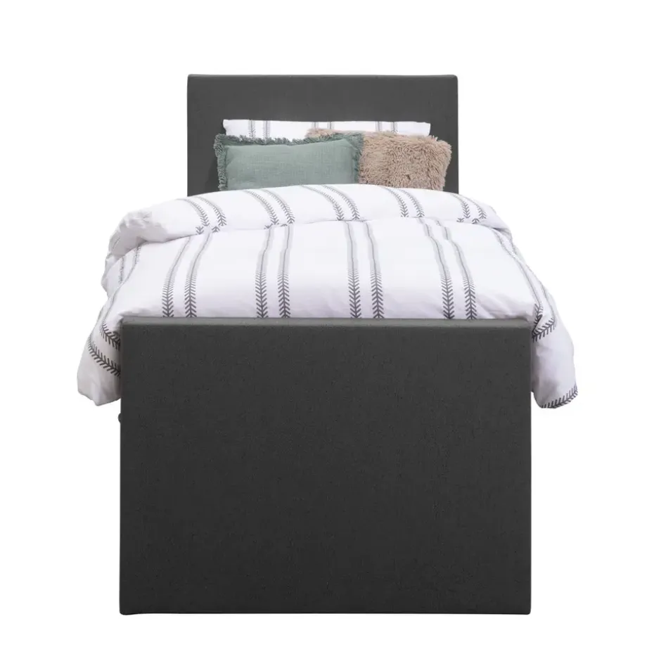 Boxspring Liv is een boxspring met een afmeting van 90×200 cm. Deze prachtige boxspring is bekleed met een grof geweven antraciete stof en heeft een strakke uitstraling met een egaal hoofd- en voetbord. De Liv egaal is uitgerust met een pocketveringmatras en daarnaast ook nog een koudschuim topdekmatras voor extra comfort. Het pocketveringmatras is omkeerbaar, bestaande uit zowel een medium- als een stevige kant. Hierdoor kun je zelf kiezen wat voor jou het meest comfortabel ligt.