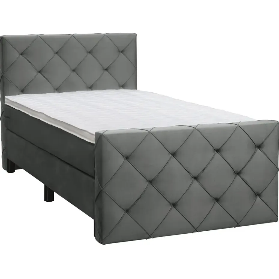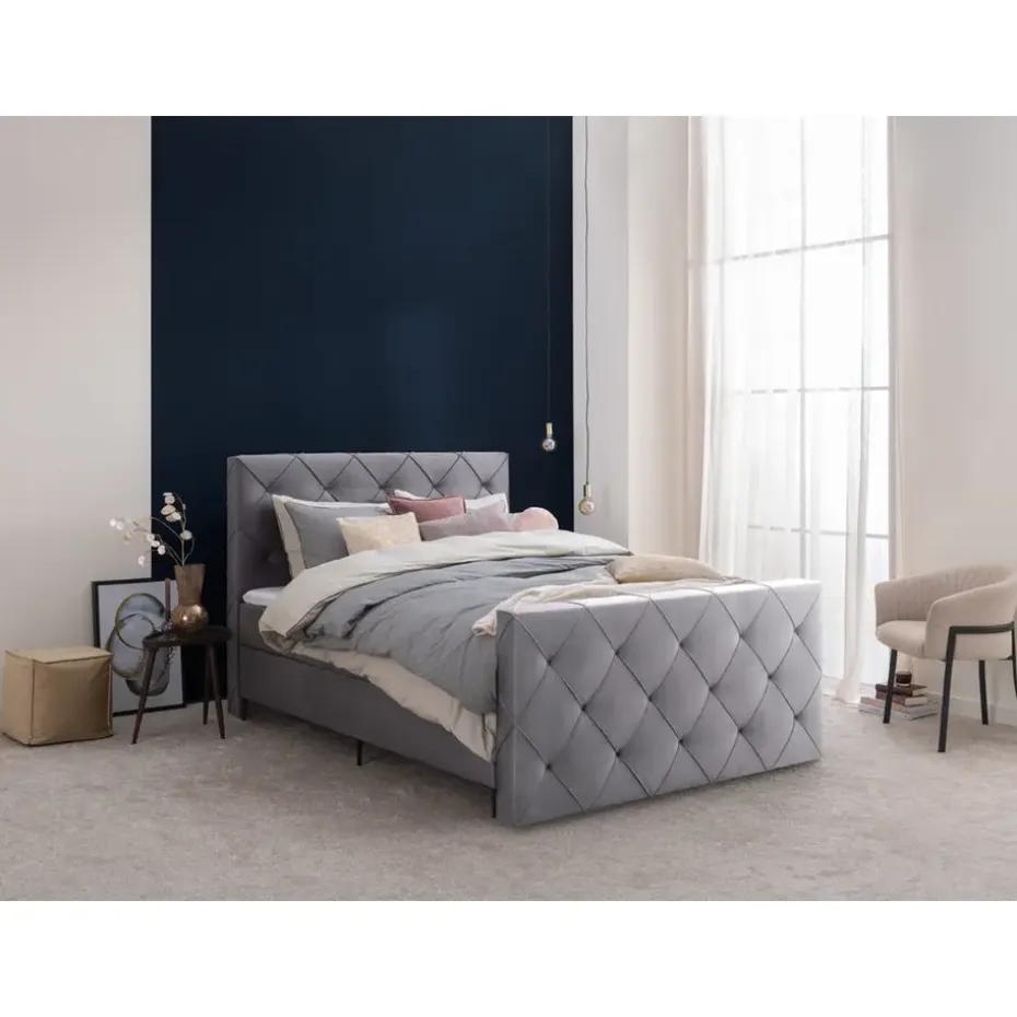 Boxspring Liv is een boxspring met een afmeting van 120×200 cm. Deze prachtige boxspring is bekleed met een velvet grijze stof en heeft een romantische uitstraling met een geruit hoofd- en voetbord. De Liv geruit is uitgerust met een pocketveringmatras en daarnaast ook nog een koudschuim topdekmatras voor extra comfort. Het pocketveringmatras is omkeerbaar, bestaande uit zowel een medium- als een stevige kant. Hierdoor kun je zelf kiezen wat voor jou het meest comfortabel ligt.