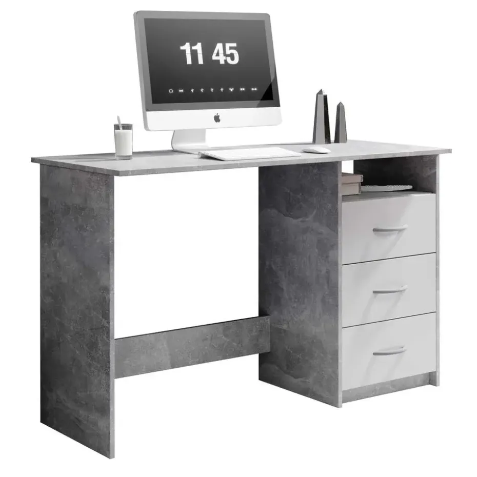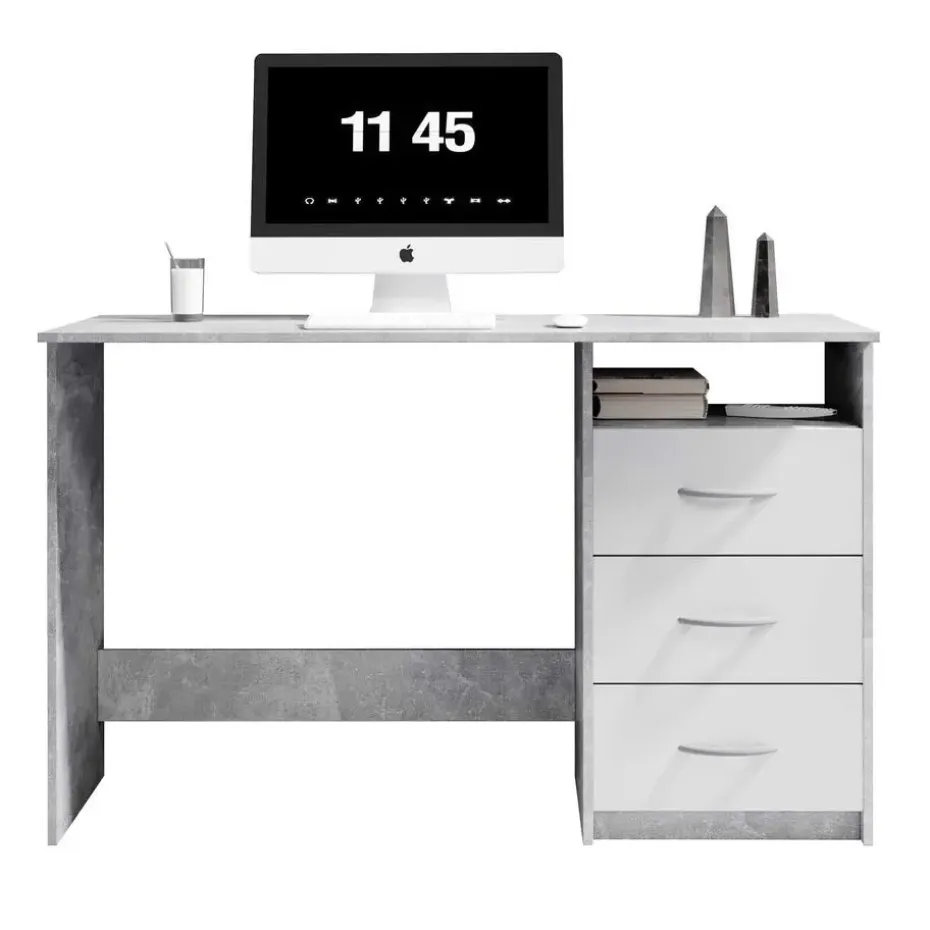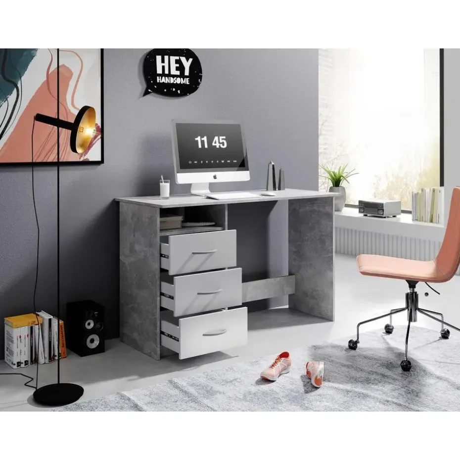 Compact bureau Adriano uit spaanplaat in betondecor, met een industrieel-moderne look. De handige afmetingen zorgen ervoor dat je het bureaumeubel in elke ruimte kan plaatsen. Toch heb je door de drie witte lades en een klein, open opbergvak voldoende ruimte om je kantoorspullen op te bergen. De handgrepen zijn bovendien makkelijk te bedienen. De ideale oplossing voor elke thuiswerker!