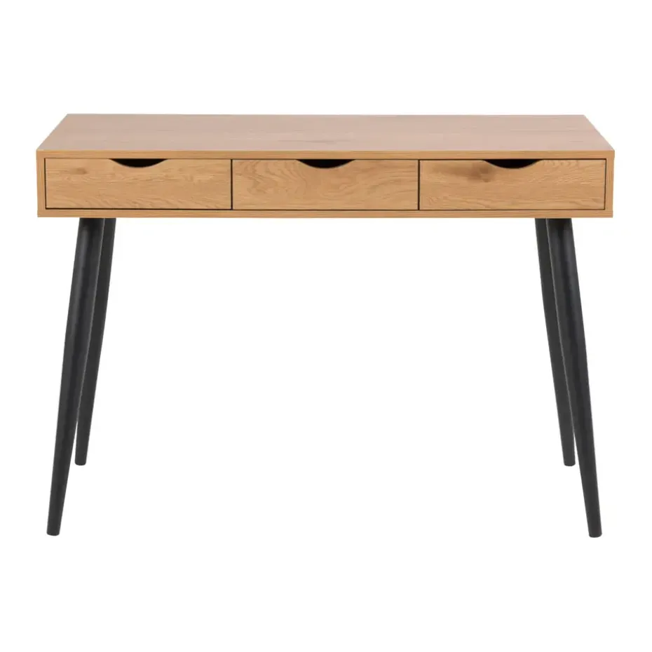 Bureau Montijo is een bureau voor de fijnproevers! Dit minimalistische bureau straalt eenvoud maar toch veel luxe uit. Het bureau is niet alleen heerlijk om aan te werken, maar misstaat ook niet in de gang of in je woonkamer als dressoir. Het design van Montijo is slank, zo heeft het bureau vier slanke, maar stevige, zwarte poten. Deze bestaan uit gelakt metaal. Het bureau heeft een fijne afmeting van 77,1x110x50 cm. De hoogte van de pootjes is 65,4 cm. Dit zorgt voor een vrije zithoogte onder het werkblad.