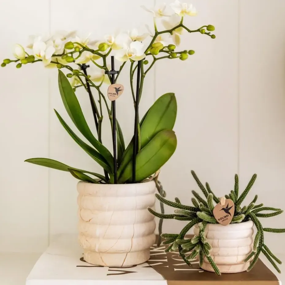 De Phalaenopsis orchidee staat graag op een lichte plek, maar niet in fel zonlicht. Geef één keer per week water door de pot kort in lauwwarm water te dompelen en goed te laten uitlekken. Verwijder uitgebloeide bloemen en knip de tak pas terug als hij helemaal is verdroogd. De succulent heeft nog minder nodig: een scheutje water om de twee à drie weken is genoeg. Beide planten zijn eenvoudig te verzorgen en zorgen lang voor sfeer en plezier in huis.