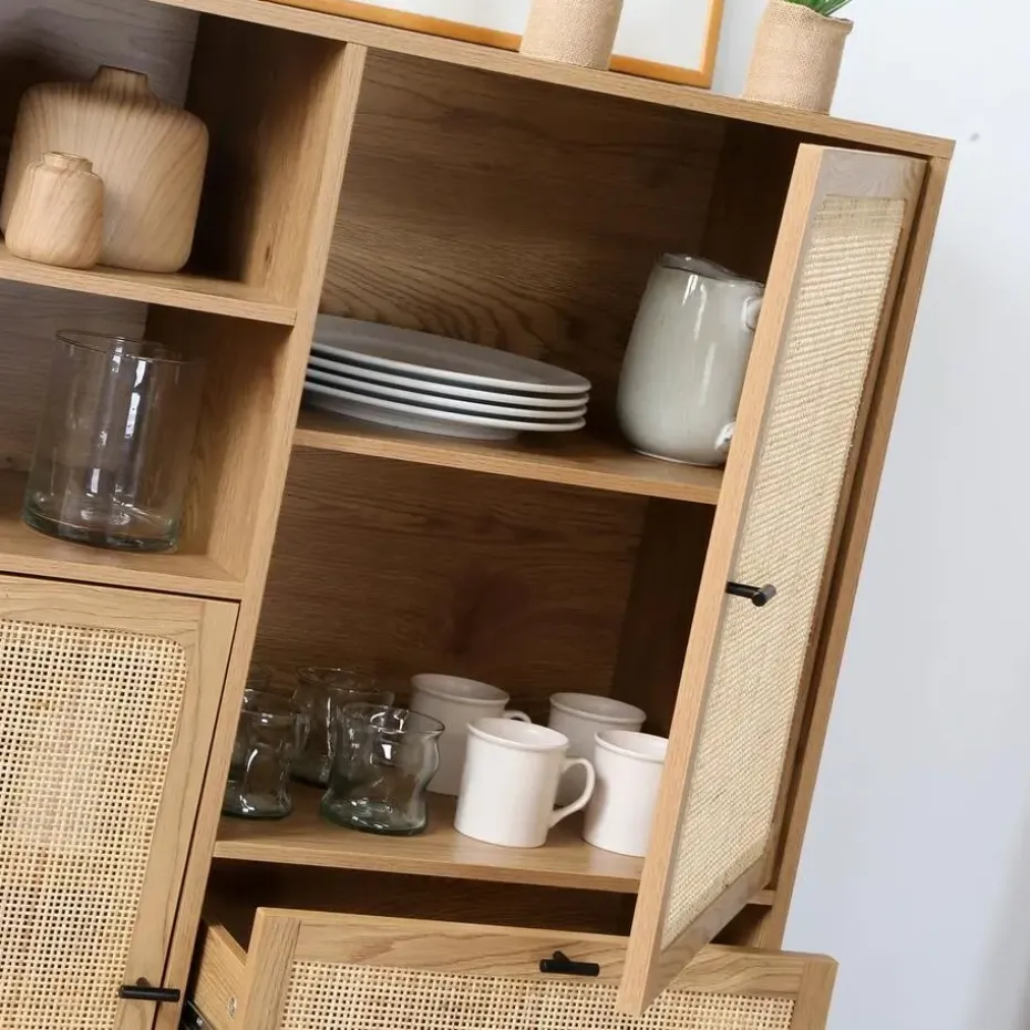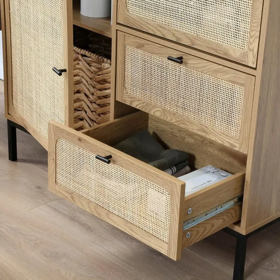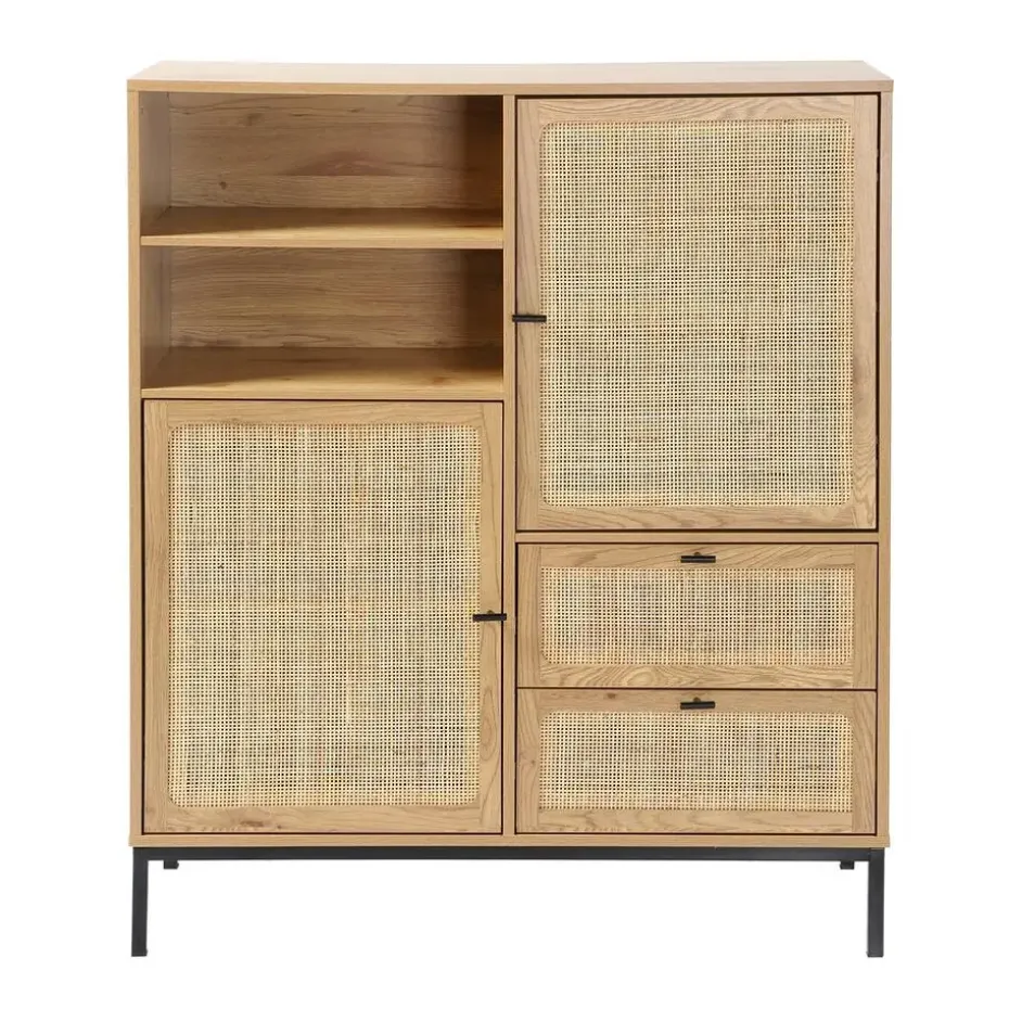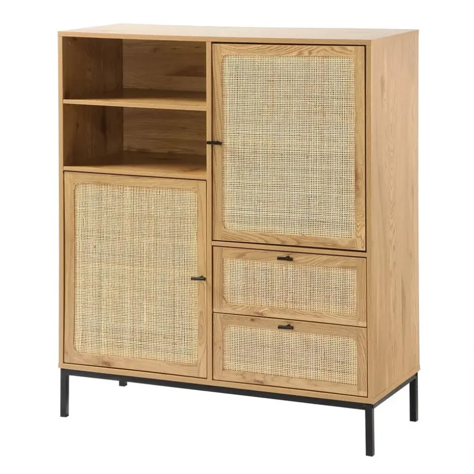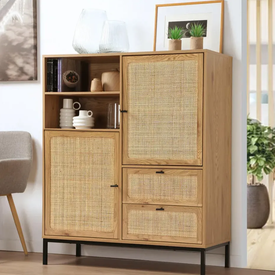 Ontdek dit prachtige hoge buffetkast met natuurlijke rotan fronten. Het exotische ontwerp past bij elk interieur en geeft een stijlvolle uitstraling aan je kamer. Dit buffet heeft verschillende opbergmogelijkheden: 2 deuren, 2 laden en 2 vakken om al je spullen in op te bergen. Productkenmerken : Natuurlijke rotan fronten. 2 deuren met 1 plank achter elke deur. 2 vakken. 2 laden gemonteerd op kogelgeleiders. Metalen poten en handgrepen. Zelfbouwmeubel: zelf te monteren. Productafmetingen : Lengte: 100 cm x Breedte: 40 cm x Hoogte: 120 cm – Nettogewicht: 39,5 kg. Verpakkingsafmetingen : Pakket nr. 1: Lengte: 108,5 cm x Hoogte: 12,5 cm x Diepte: 46 cm – Gewitch : 20kg. Pakket nr. 2: Lengte: 109,5 cm x Hoogte: 11,5 cm x Diepte: 55 cm – Gewitch : 21,5kg. Totaal bruto gewicht : 41,5 kg.