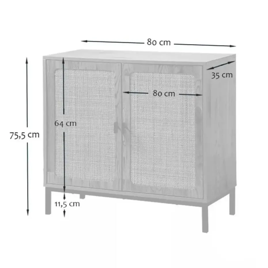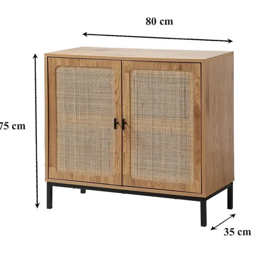 Productkenmerken: Buffetkast met 2 deuren. Structuur van spaanplaat. Voorkanten van natuurlijk rotan. Zwarte metalen poten. 1 in hoogte verstelbare plank achter de deuren. De deuren kunnen in beide richtingen worden gemonteerd. Productafmetingen: Lengte 80 cm x breedte 35 cm x hoogte 75 cm – Nettogewicht: 19 kg. Afmetingen van het pakket: Enkel pakket: Lengte 86,5 cm x Hoogte 18 cm x Breedte 44,5 cm. Brutogewicht: 20 kg.