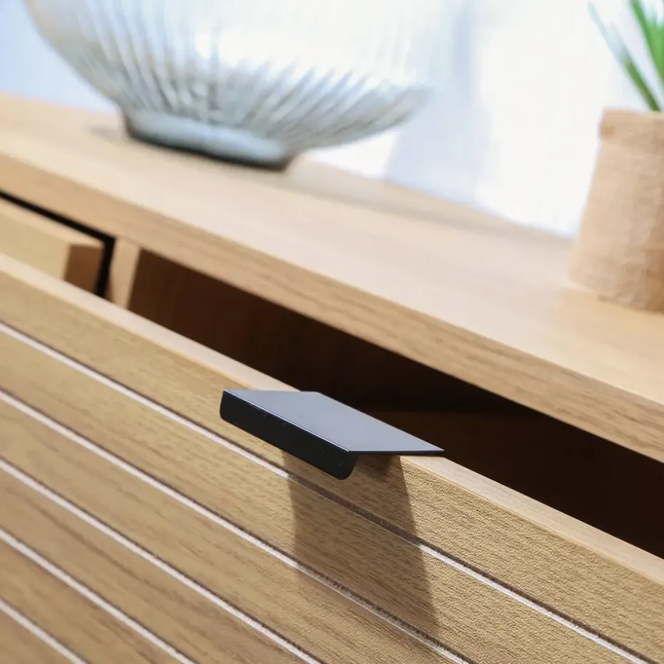 Producteigenschappen: Ontdek onze ladekast met 2 deuren en 2 lades, perfect voor het opbergen van al uw spullen in een compact meubelstuk met een modern design. Ideaal voor extra opbergruimte in uw slaapkamer of voor het inrichten van uw woonkamer. Meubel gemaakt van spaanplaat, voorkant in MDF met zwarte metalen poten. Ladefronten met horizontaal lamelleneffect en deuren met verticale lamellen. Handgrepen van zwart metaal, poten van zwart metaal. Productafmetingen: Lengte 90 cm x Breedte 39 cm x Hoogte 79 cm – Nettogewicht: 26 kg. Afmetingen pakket: Lengte 99 cm x Breedte 39 cm x Hoogte 79 cm – Brutogewicht: 27 kg.