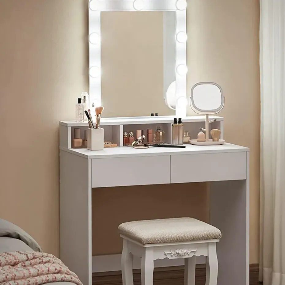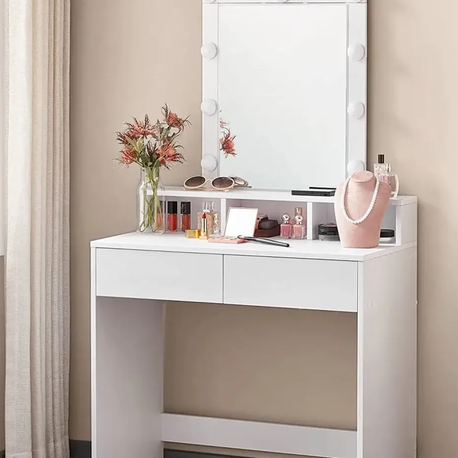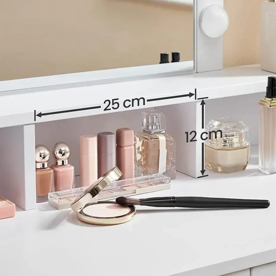 Ontdek onze witte kaptafel met spiegel en 2 laden – L80 x H145 cm. Deze kaptafel is ideaal voor dagelijks gebruik dankzij de handige opbergruimte. De Hollywood-stijl spiegel met verstelbare lichtintensiteit zorgt ervoor dat je jezelf optimaal kunt opmaken. Productkenmerken: Hoofdmateriaal: spaanplaat. Wordt geleverd als bouwpakket. Zelf in elkaar te zetten. Gebruiksaanwijzing meegeleverd. Met spiegel, spiegelomlijsting met lampen. 2 laden. 3 open compartimenten. Verstelbare lichtintensiteit van de lampen. Kruk niet inbegrepen. Productafmeting: Lengte 80 cm x Diepte 40 cm x Hoogte 145 cm – Netto gewicht: 23,5 kg. Afmetingen van het pakket: Pakket nr. 1: Hoogte 51 cm x Breedte 93,5 cm x Diepte 22 cm – Bruto gewicht: 26,5 kg.