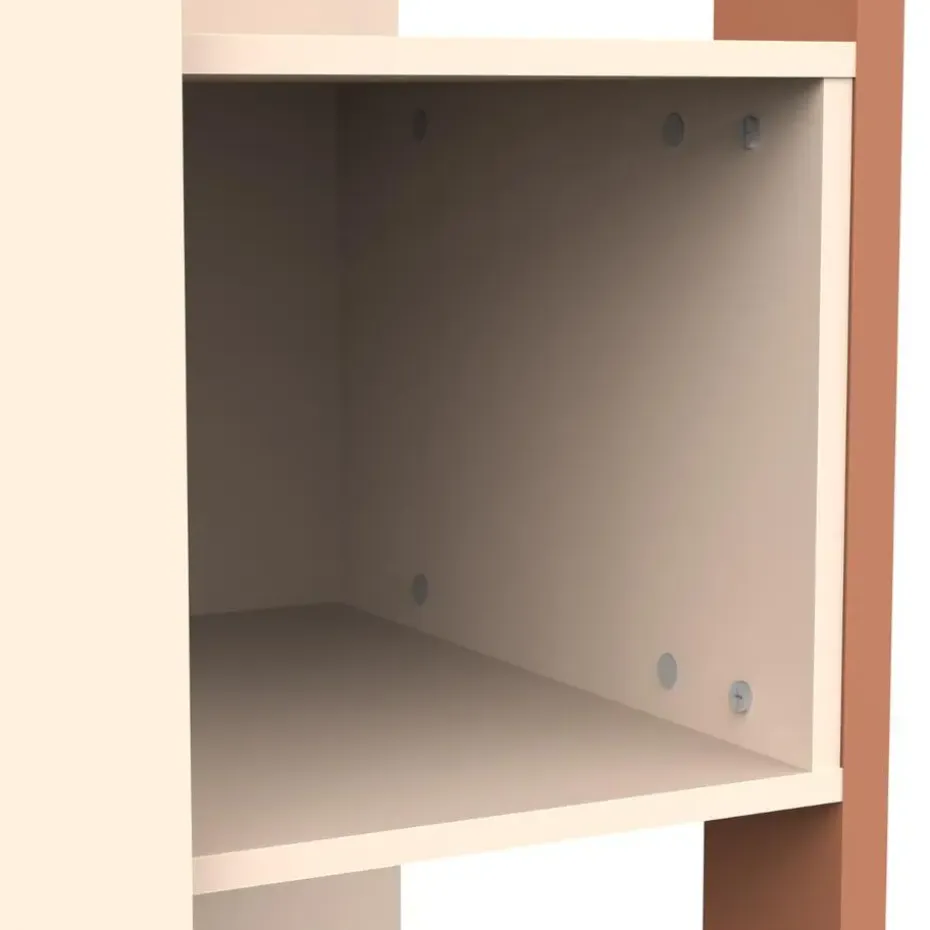 - Melamine in zandbeige. Staanders van terracotta-melamine. Bodempaneel in melamine met eikenhoutdecor.