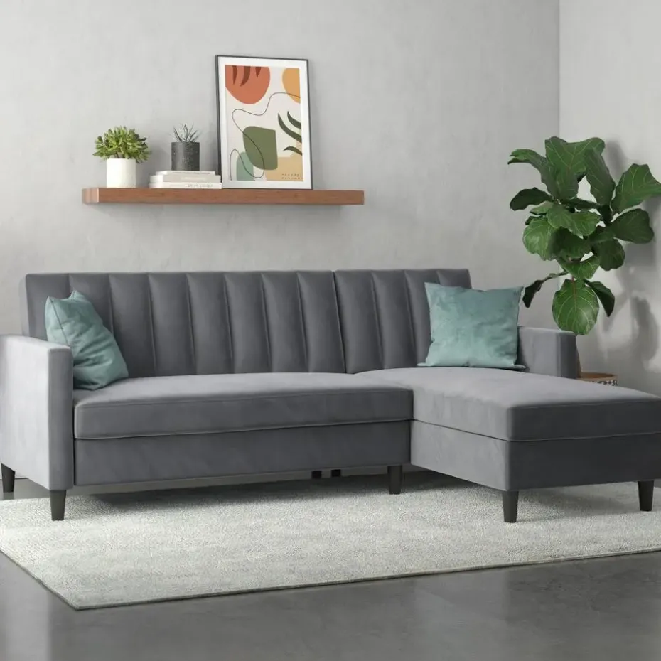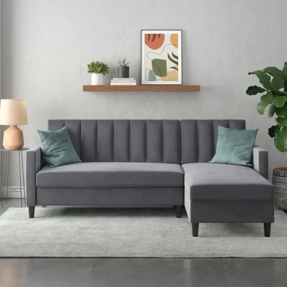 Deze slaapbank heeft een moderne stijl. Het is gemaakt van gefabriceerd hout en een fluwelen hoes. De vulling is gevuld met schuim voor optimaal comfort. De hoekbank heeft een uitbreidbaar slaapoppervlak en kan als logeerbed worden gebruikt. Het is handmatig verstelbaar. De chaise longue kan worden geopend voor opslag.