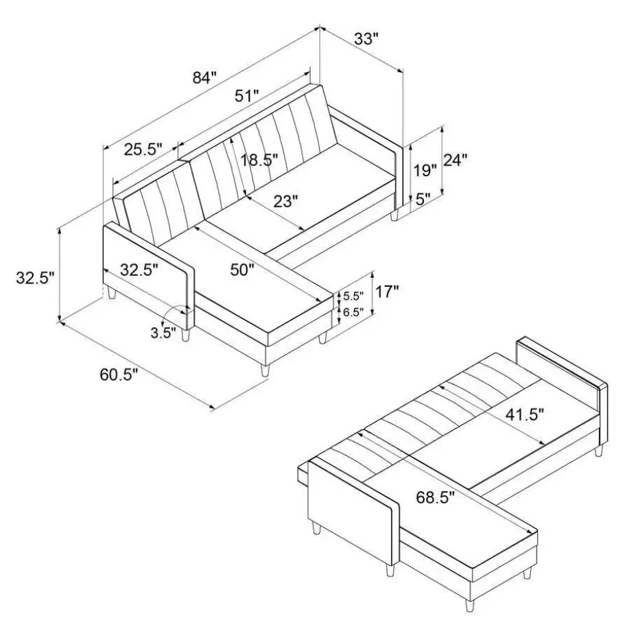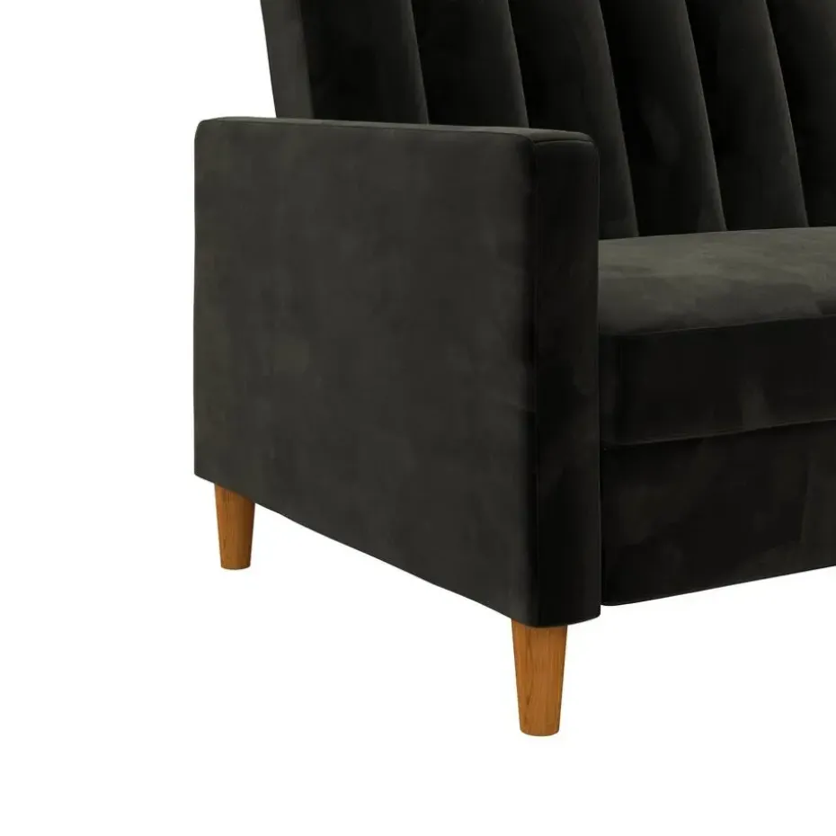 Moderne converteerbare hoekbank met fluwelen bekleding en verticale stiksels in de rugleuning.
