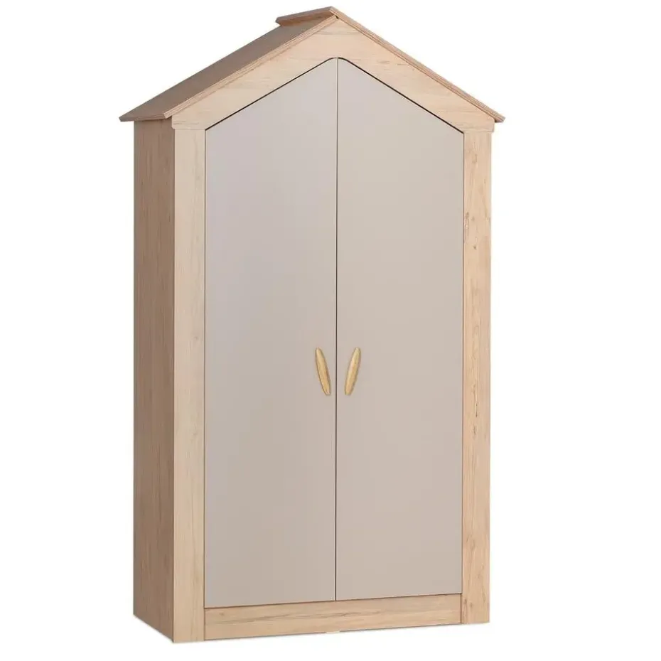 De Cento 2-deurs kledingkast in houtlook met grijze accenten is een stijlvolle en praktische keuze voor de kinderkamer. De kast heeft een warme uitstraling en is ontworpen met oog voor functionaliteit en kwaliteit. Dankzij de slimme indeling met meerdere schappen en een hanggedeelte biedt deze kast voldoende ruimte om kleding netjes op te bergen.